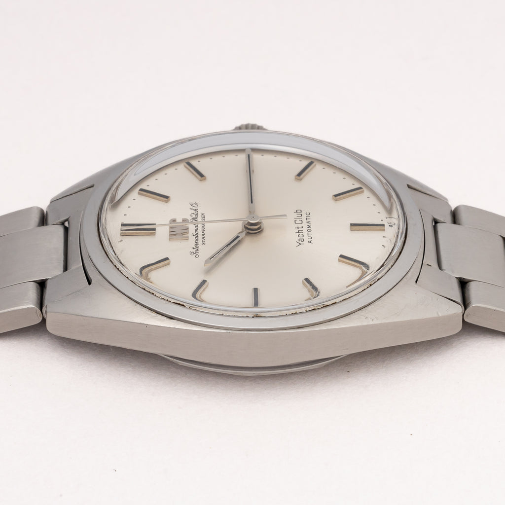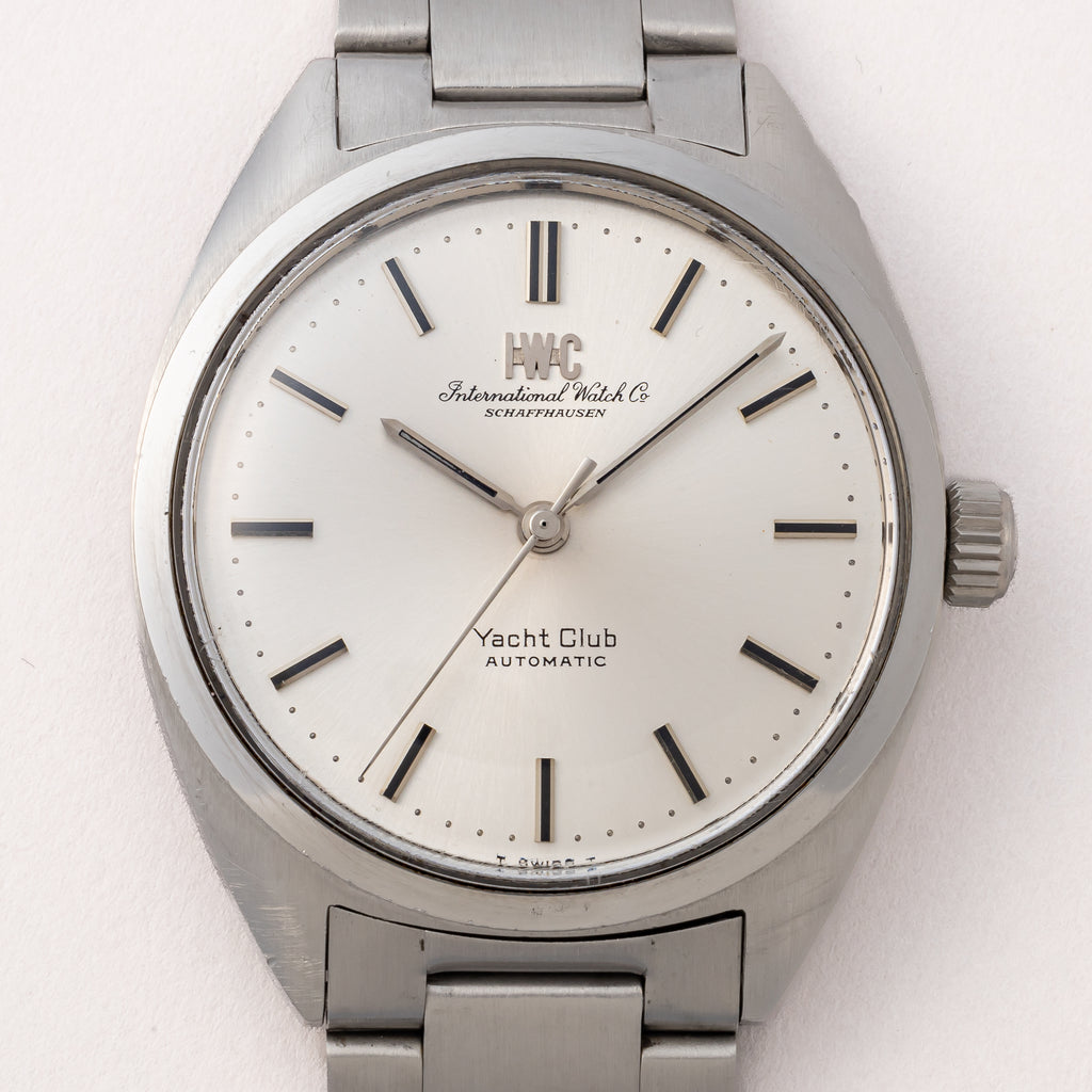 インターナショナルウォッチカンパニーのヨットクラブ1973年製です。人気のノンデイトはシンプルで格好良いです。表記は人気の筆記体とIWCの両方となっています。しっかりとした厚みの防水ケースは小傷が見られますが大きなダメージはありません。ムーブメントはペラトン式の完成形Cal.854Bを搭載しています。意外と貴重な純正の3連ステンレスブレスも嬉しいポイントです。