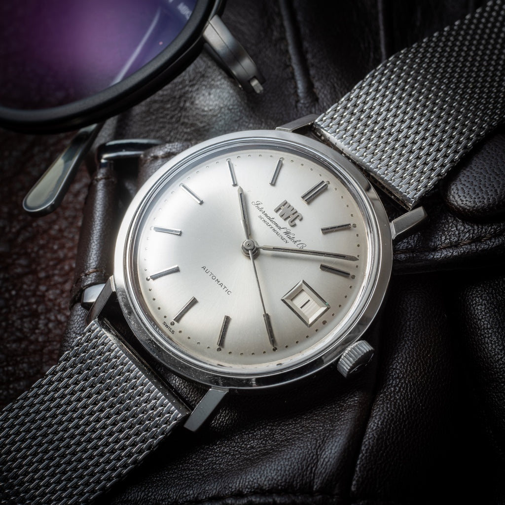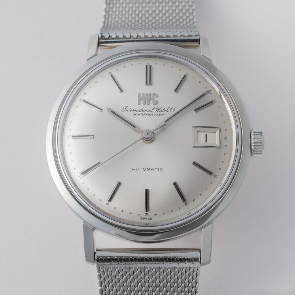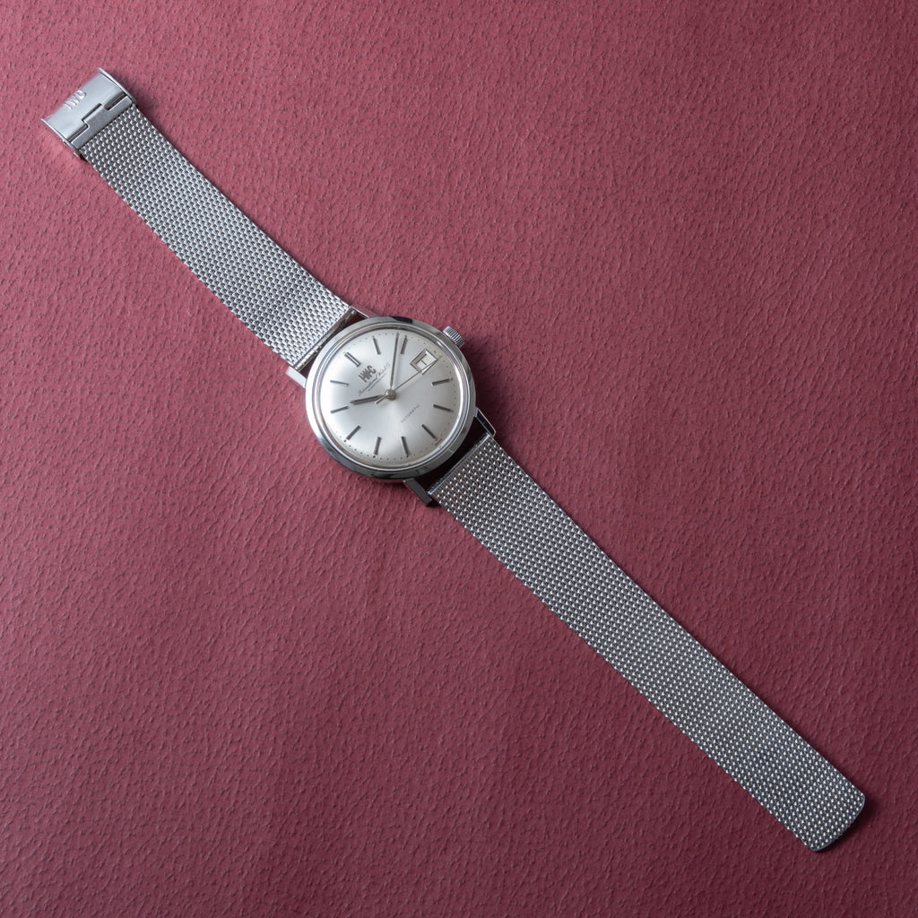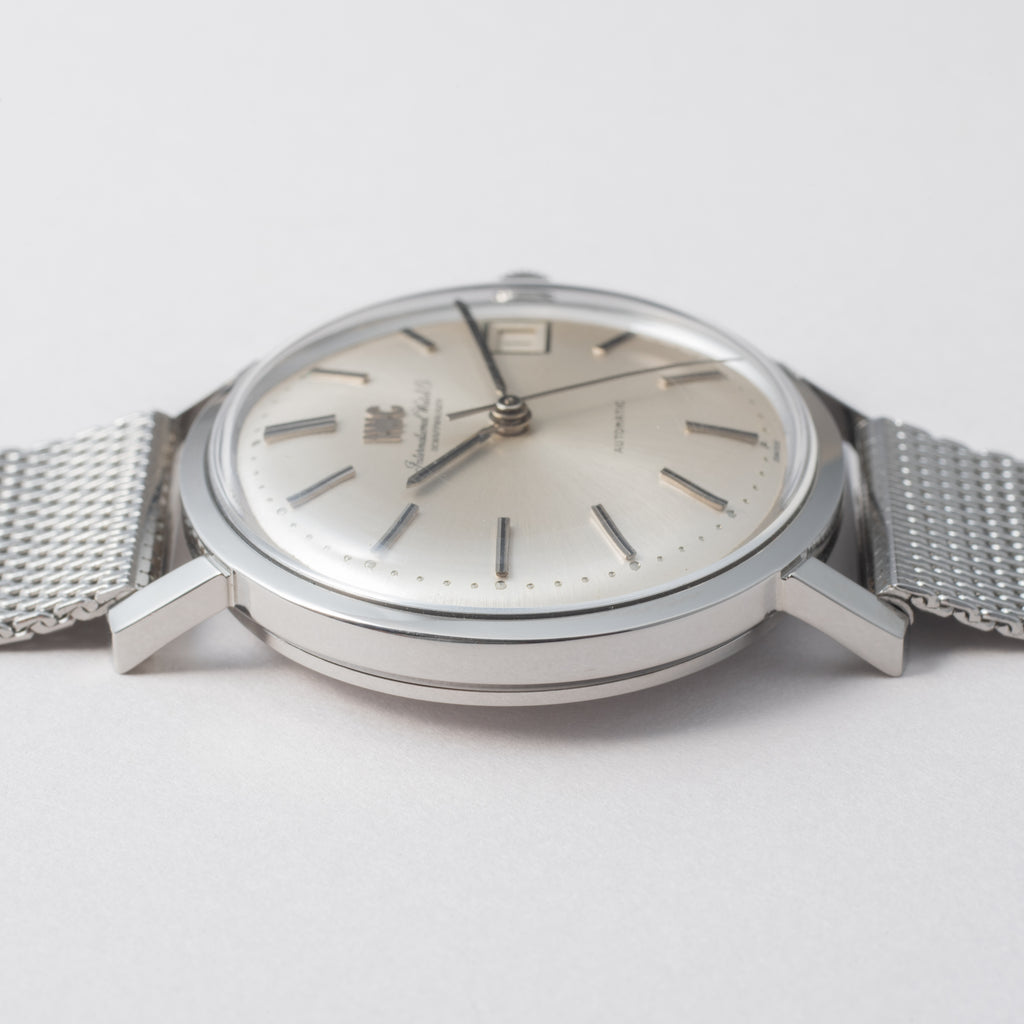 インターナショナルウオッチカンパニーの1970年製 自動巻きラウンドケースです。ペラトン式自動巻きの完成形Cal.8541Bを搭載したオールドインターらしい質実剛健なモデルです。シルバーダイヤルは、気になるダメージのない良好な状態で、IWCとインターナショナルウォッチカンパニーの両方が表記されている人気の仕様です。ケースはお魚リューズが付いており、小傷はありますが、ラグの面取りがしっかりと残るシャープな状態です。ベルトは純正メッシュブレスを合わせています。