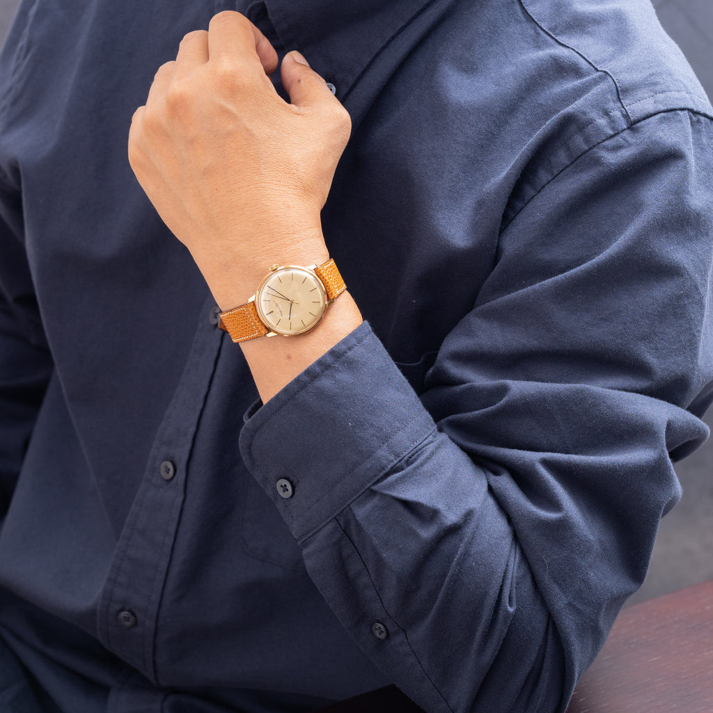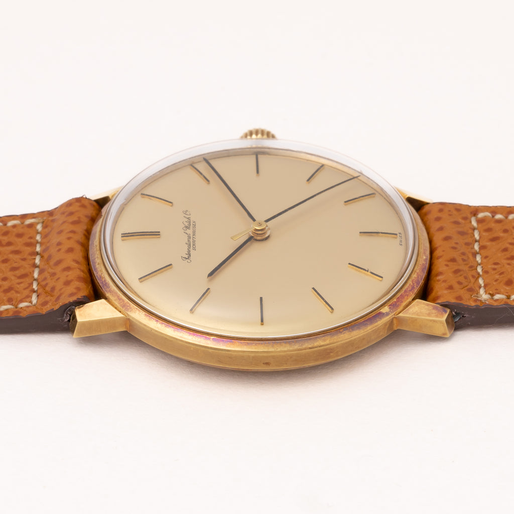 IWCの18YGの手巻きモデル1970年製になります。小傷のみの良好な相場のケースは18YGで非常に高級感があります。ブラックのバーインデックスはながらシンプルゴールドのダイヤルにも存在感があります。巻きのCal.403も巻き上げもスムーズです。ベルトはゴールドのケースと相性の良いライトブラウンのカーフを合わせております。