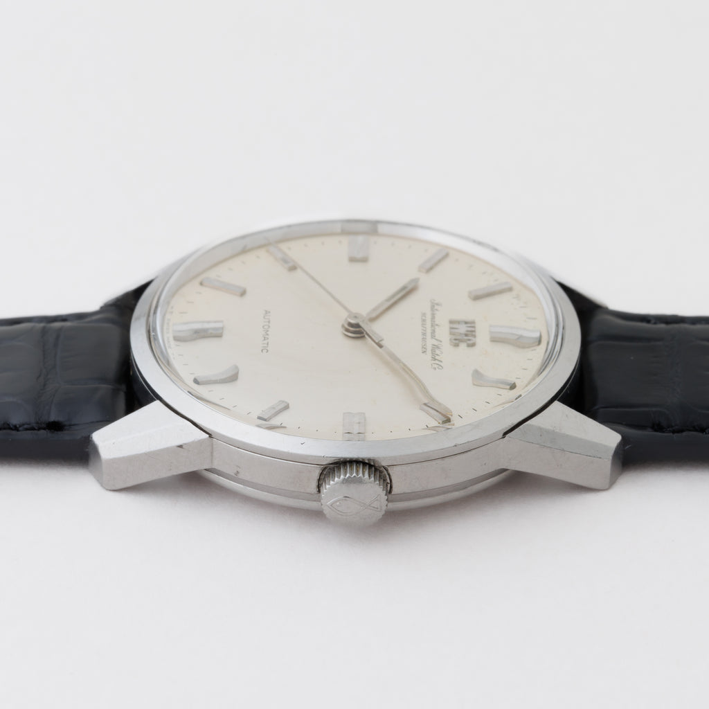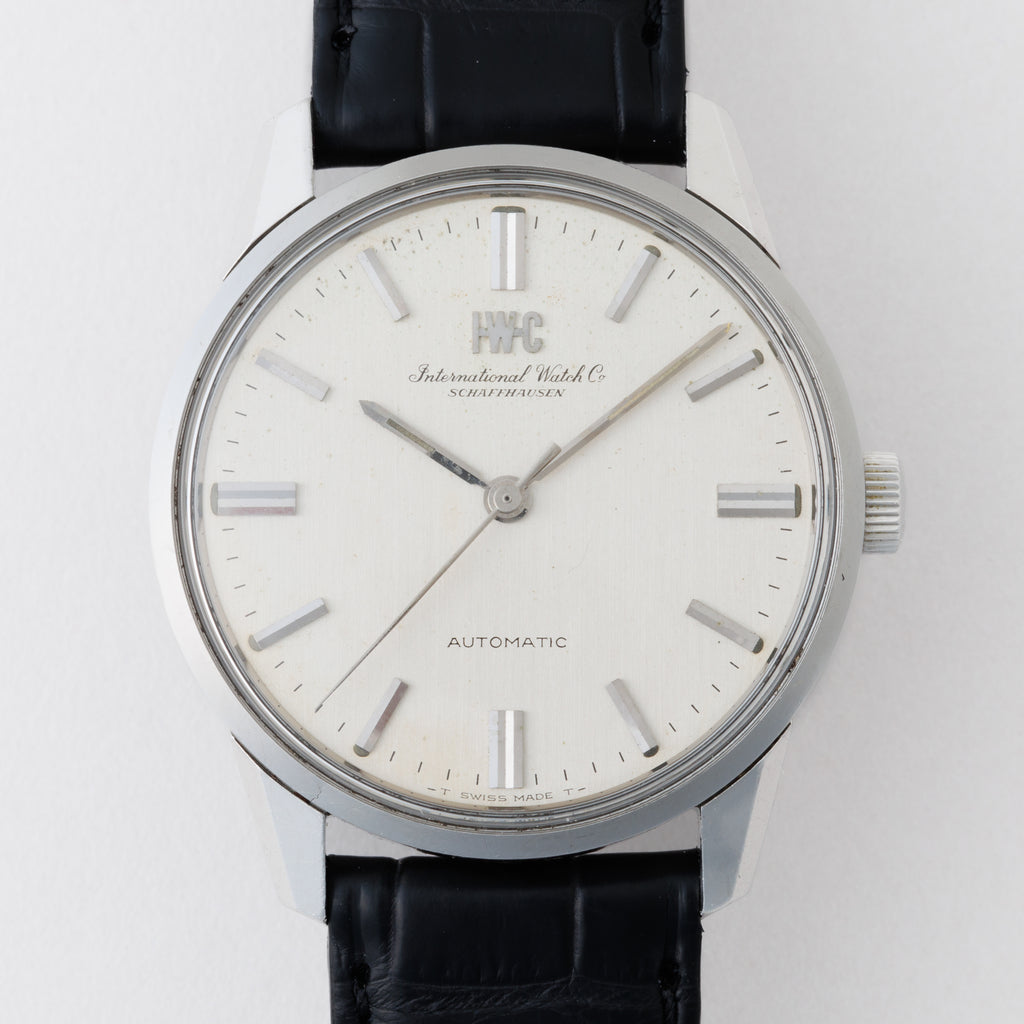 IWC インターナショナルウォッチカンパニーの1967年製 ラウンドケースです。ダイヤルはアップライトのIWCロゴと、筆記体のブランド名の両方入ったタイプです。ダイヤルはやや経年はありますが良い雰囲気です。ケースは魚竜頭が付くパッキンの入るスナップバックケースで、小傷はあるものの全体的な状態は良いです。ムーブメントは、ペラトン式自動巻きのCal.854を搭載しており動作もスムーズです。ベルトはファイアーキッズオリジナルのクロコダイルを合わせています。こちらは分解掃除済みです。