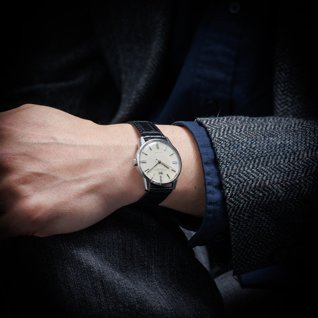 • ヴィンテージ時計の特性上、風防・パッキン・リューズ・バネ棒などの消耗部品は後年メンテナンス過程で交換されている場合がございます。オリジナル性を重視しておりますが、必要に応じて適切な部品にて調整されていますので、よりコレクション性重視のお求めのお客様は事前にご確認ください。
