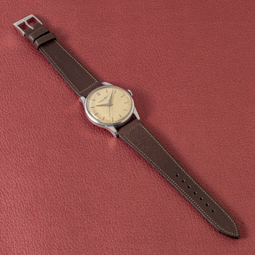 インターナショナルウォッチカンパニー1957年製 ラウンド手巻モデルです。搭載キャリバーはマークⅪに採用されている事でも有名な手巻の名機Cal.89。ケースはシンプルなラウンド型で、IWCらしい質実剛健さを感じる一本です。文字盤は砲弾インデックス、パールドットの組み合わせに全体が経年変化したヴィンテージらしい雰囲気になっています。ケースは小傷はございますが大きなダメージはございません。手巻きや針回しの操作はスムーズです。ベルトはアキュレイトフォルムの革ベルトを合わせています。こちらはオーバーホール済みです。