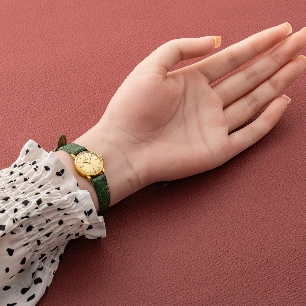1970年製のIWCレディース18金無垢手巻きモデルです。18金無垢のラウンドケースは、ケース経21mmと可愛らしいサイズ感です。高級感のあるシャンパンゴールドの文字盤は肉眼で目立つダメージはありません。ケースに小傷はありますが、磨きを感じないオリジナルのシェイプを保った状態です。ムーブメントは手巻きのCal.432を搭載。手巻きや針回しの操作はスムースです。社外の革ベルトが取り付けられています。