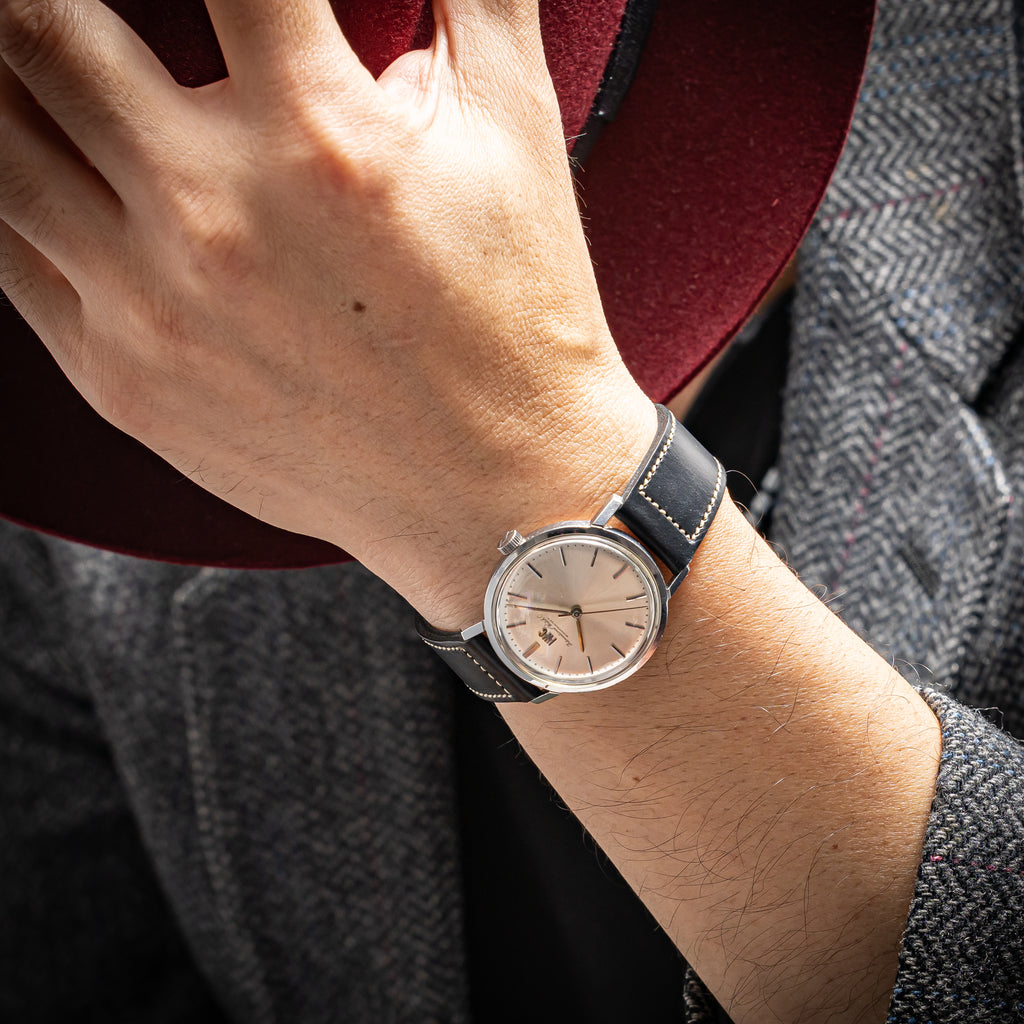 1970年製のインターナショナルウオッチカンパニーのラウンド手巻モデルです。 搭載キャリバーはマークⅪなどに採用された事でも有名な手巻の名機Cal.89。 ケースはシンプルなラウンド型で、ラグは70年代らしい直線デザインです。 サイズは35mmとカジュアル・ビジネスで使いやすいサイズです。 ケースは全体に小さなキズはありますが、焦らない仕上げのない自然な状態です。 ベルトはヴィンテージウォッチに最適のアキュレイトフォームを装着しています。