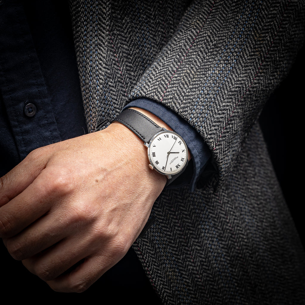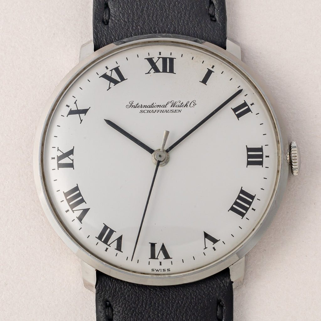 IWC 1970年製 ローマンダイヤル Ref.1410 手巻きCal.402 です。ホワイトローマンダイヤルは上品で薄型のケースが魅力的です。文字盤は目立つシミ等無く綺麗です。ケースは小傷が見られますが大きなダメージはありません。手巻きや針回しの操作はスムースです。ベルトは社外の革ベルトを合わせています。こちらは分解掃除済みです。