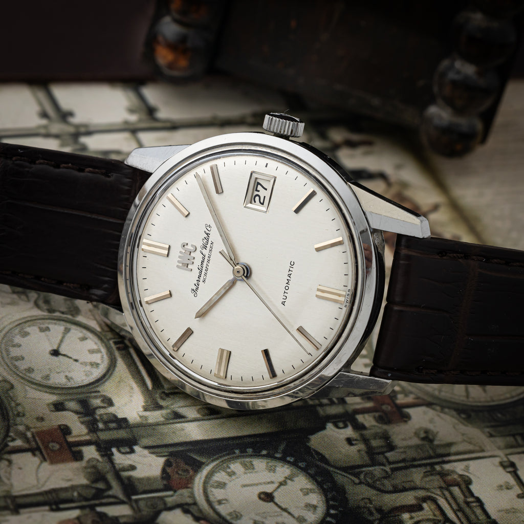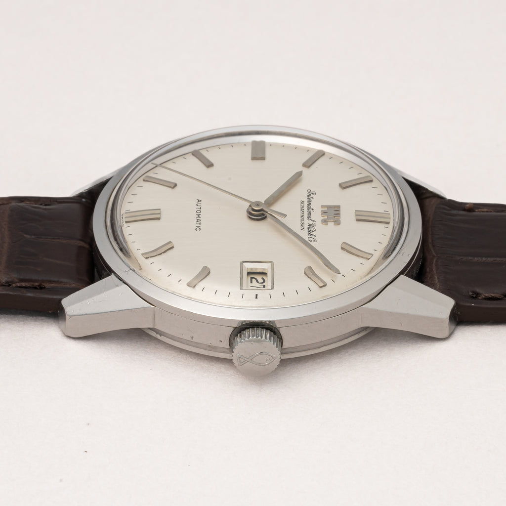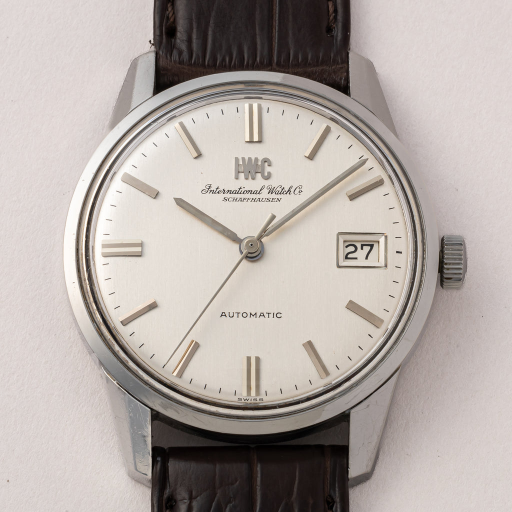 インターナショナルウオッチカンパニーの1971年製自動巻きラウンドケースです。IWCとインターナショナルウォッチカンパニーの書き込みの両方表記されている人気モデルです。ペラトン式自動巻きの完成形Cal.8541を搭載したモデルでオールドインターらしいシンプルですな質実剛健なモデルです。 シンプルだからこそ造りの良さが感じられます。ベルトはファイアーキッズオリジナルのクロコダイルを合わせています。