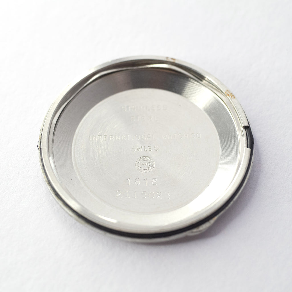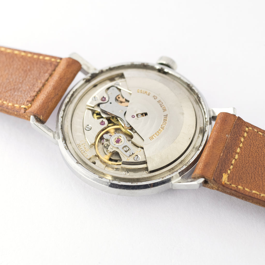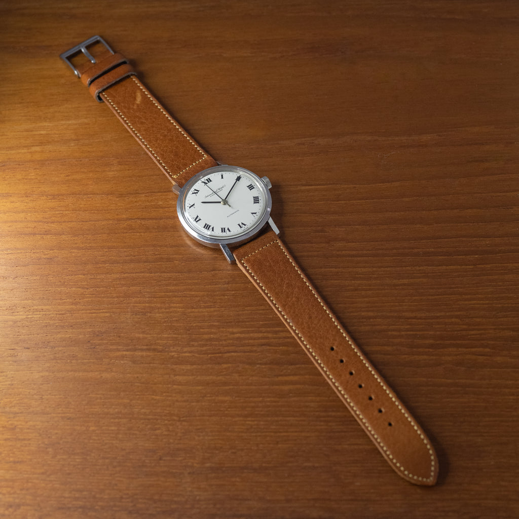 1971年製のインターナショナルウオッチカンパニーホワイトローマンダイヤルオートマチックモデルです。人気のノンデイトでIWCらしいシンプルなデザインにホワイトローマンダイヤルで視認性の良い黒色の針もスッキリとした印象です。文字盤は目立つシミや傷などダメージは無く良い状態です。ムーブメントは巻き上げ効率の良いペラトン式自動巻き上げ機構のCal.854Bを搭載。リューズはお魚リューズです。ケースに細かな小傷はありますが大きなダメージはありません。手巻きや針回しの操作はスムースです。ベルトはヴィンテージモデルに相性抜群な「Accurate Form(アキュレイトフォルム)」のレザーベルトを装着しています。手巻きや針回しの操作はスムースです。