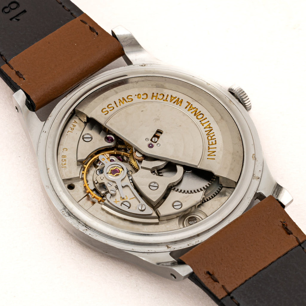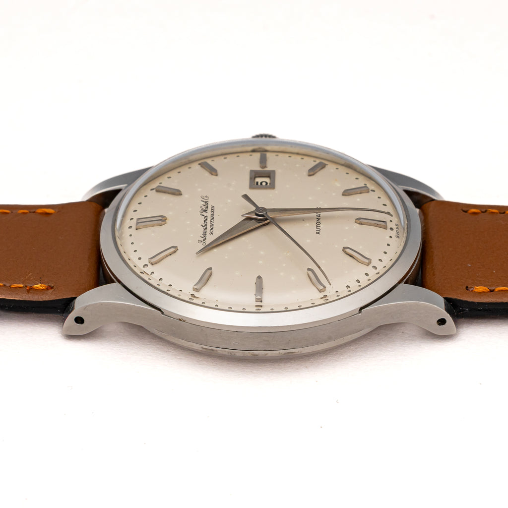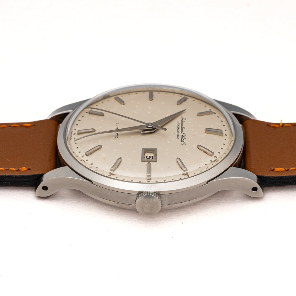 インターナショナルウォッチカンパニー シルバーダイヤル 自動巻き ステンレス Cal.8531 1962年製です。こちらは、カレンダーが中央に寄っているタイプで通称『寄り目』と呼ばれていてます。IWCらしいシンプルな文字盤デザインと針の組み合わせに、パールドットの分点が映えます。文字盤全体もドーム型にラウンドしており針も合わせてカーブを描いていてヴィンテージ感があります。お魚リューズが付いています。ムーブメントは自社キャリバーのペラトン式自動巻きのCal.8531を搭載しています。ケースは小傷が見られますが大きなダメージはありません。ダイヤルは文字盤全体がアイボリーに変色して雰囲気が良いです。ベルトは社外のカーフが取り付けられています。こちらの時計は分解掃除済みです。