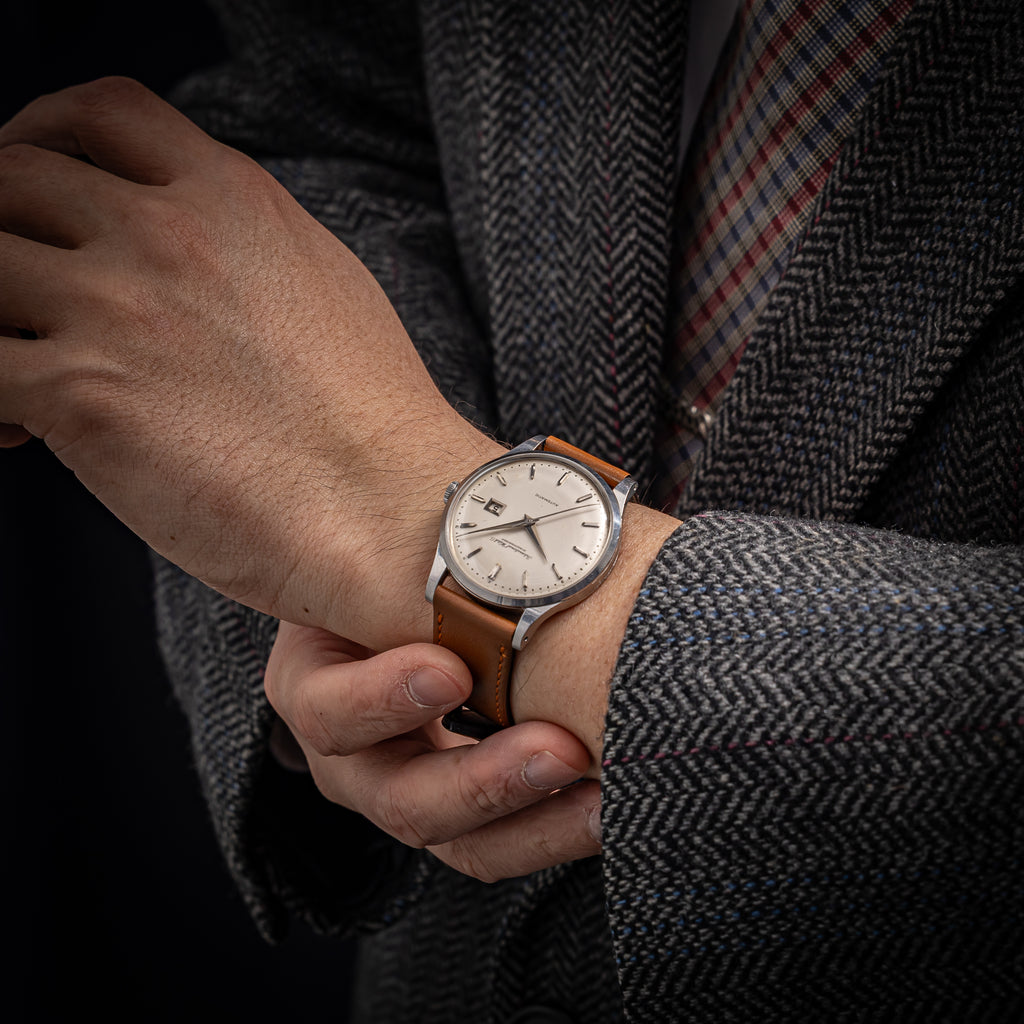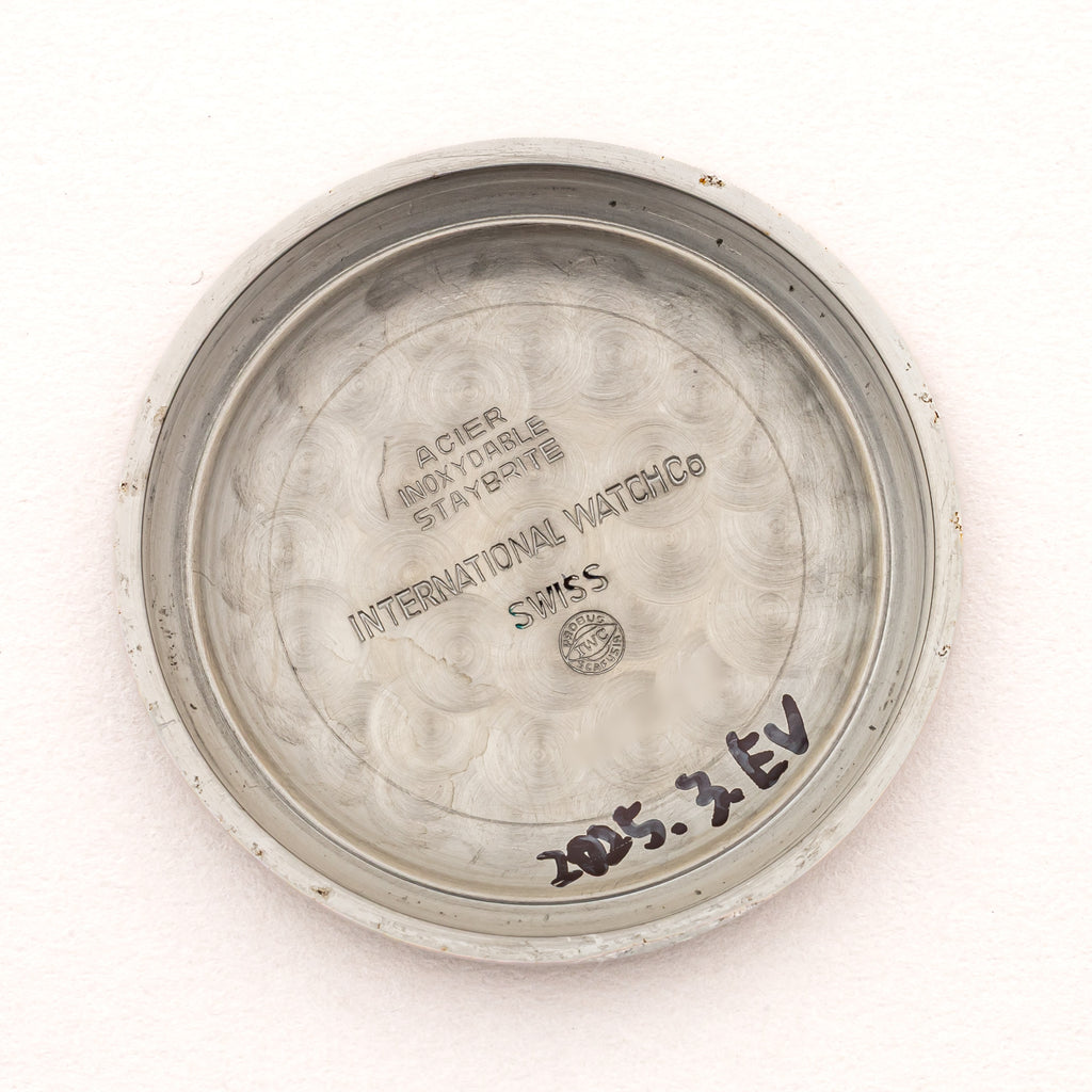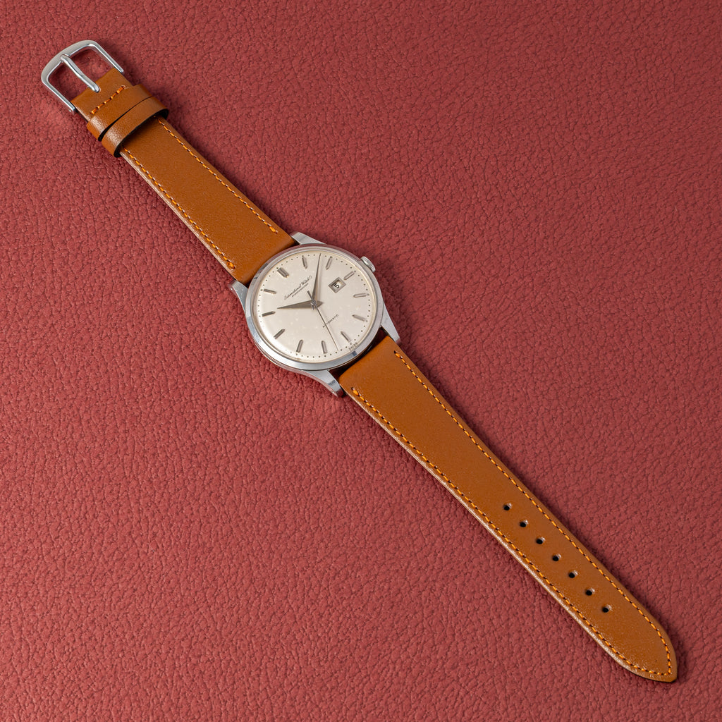 インターナショナルウォッチカンパニー シルバーダイヤル 自動巻き ステンレス Cal.8531 1962年製です。こちらは、カレンダーが中央に寄っているタイプで通称『寄り目』と呼ばれていてます。IWCらしいシンプルな文字盤デザインと針の組み合わせに、パールドットの分点が映えます。文字盤全体もドーム型にラウンドしており針も合わせてカーブを描いていてヴィンテージ感があります。お魚リューズが付いています。ムーブメントは自社キャリバーのペラトン式自動巻きのCal.8531を搭載しています。ケースは小傷が見られますが大きなダメージはありません。ダイヤルは文字盤全体がアイボリーに変色して雰囲気が良いです。ベルトは社外のカーフが取り付けられています。こちらの時計は分解掃除済みです。