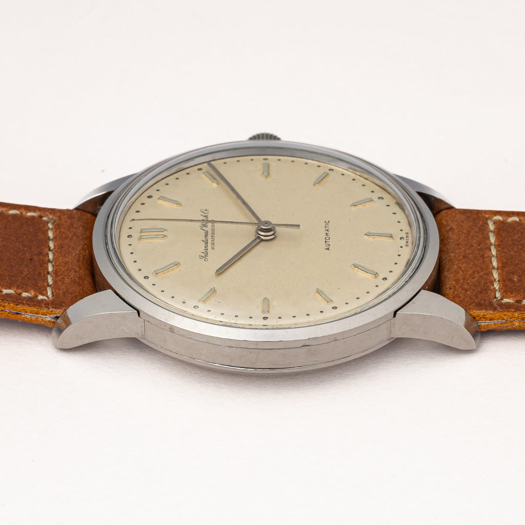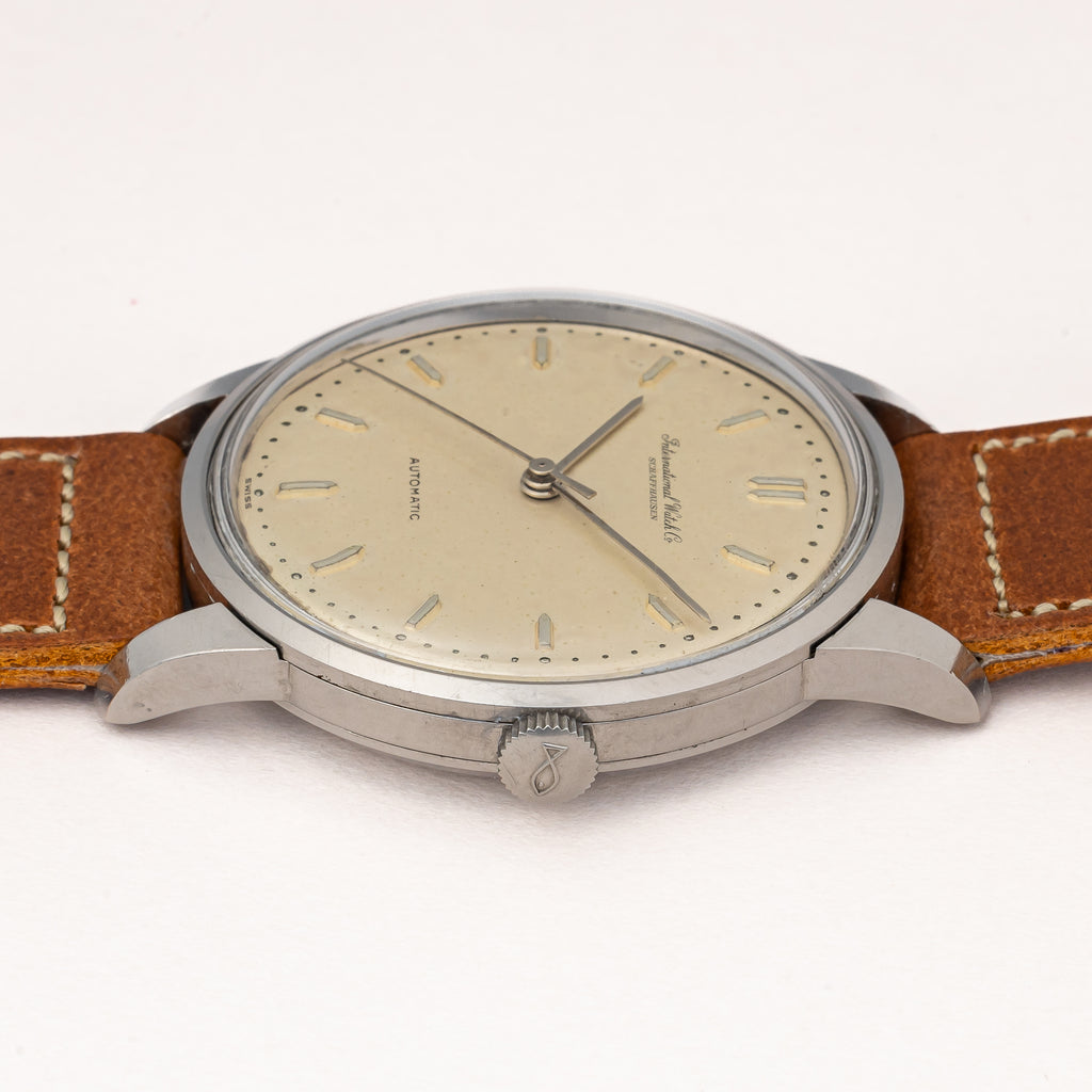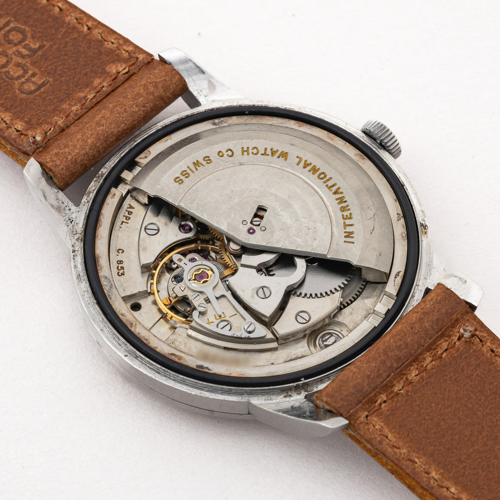 IWC ラウンドケース 1962年製 ペラトン式自動巻き Cal.853 ノンデイト お魚リューズ付きです。奇をてらわないシンプルなデザインはインターナショナルの代名詞でもあり、真摯な時計作りはビギナーからマニアまで幅広い人気があります。アイボリーの文字盤も程よい焼け具合で雰囲気も良いです。ムーブメントはペラトン式自動巻きのCal.853を搭載。ケースは小傷はございますが大きなダメージはございません。手巻きや針回しの操作はスムースです。ベルトはヴィンテージと相性の良いアキュレイトフォルムが取り付けられています。