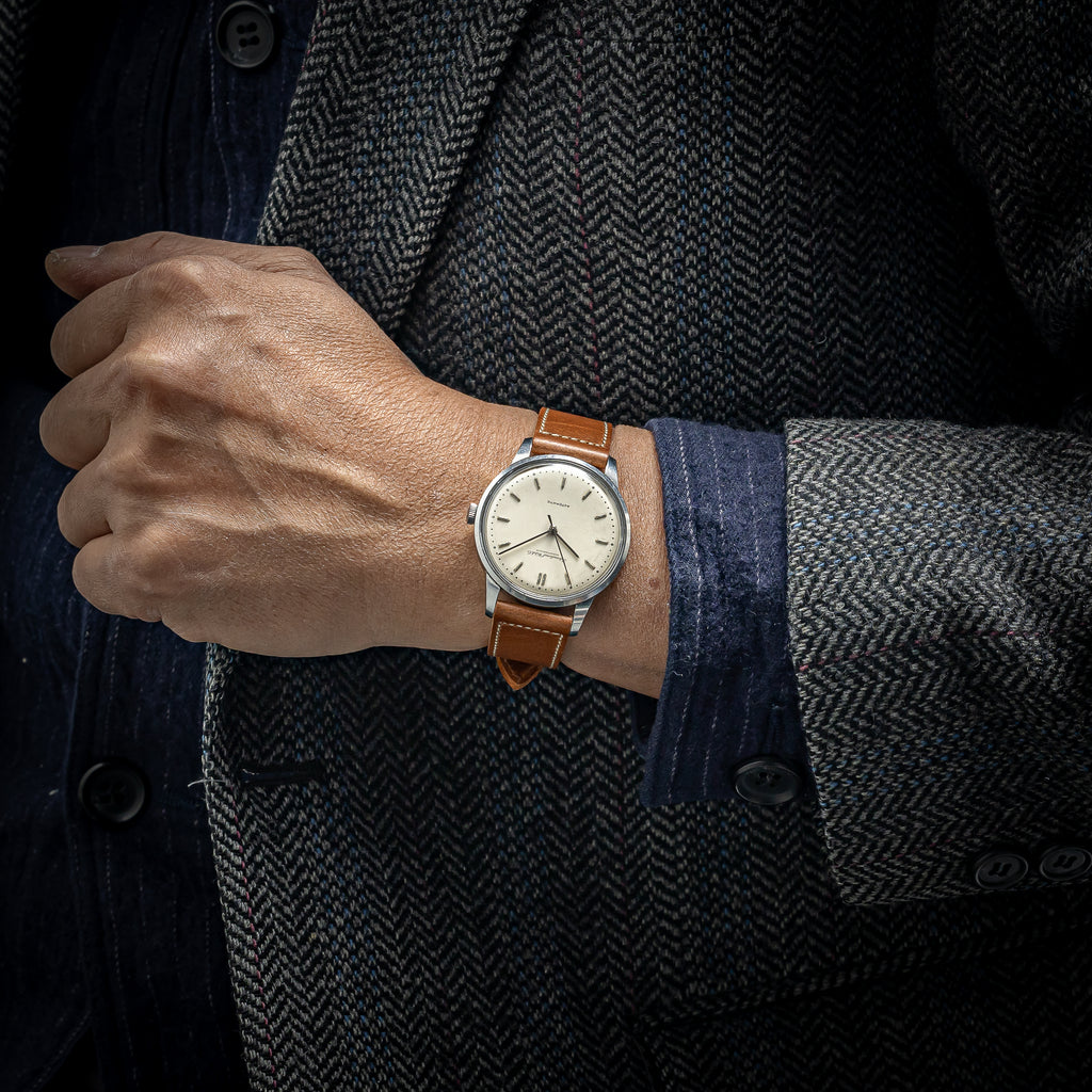 • ヴィンテージ時計の特性上、風防・パッキン・リューズ・バネ棒などの消耗部品は後年メンテナンス過程で交換されている場合がございます。オリジナル性を重視しておりますが、必要に応じて適切な部品にて調整されていますので、よりコレクション性重視のお求めのお客様は事前にご確認ください。