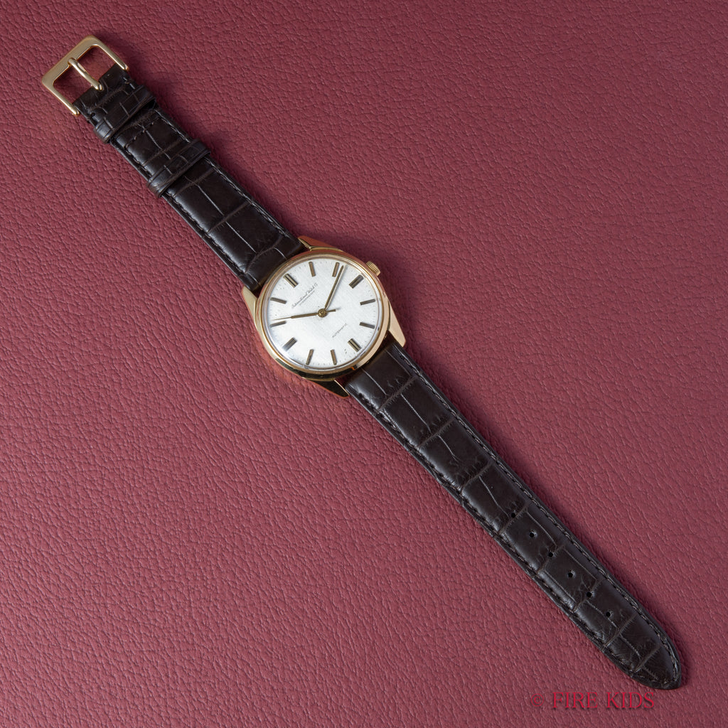 インターナショナルウオッチカンパニーの1967年製 自動巻き 18金無垢ケースです。スタンダードなモデルであるRef.810Aの金無垢ケース仕様という位置づけで、ステンレスケースとは違った特別感があります。文字盤は、メーカー名が筆記体で入る人気のタイプです。コンディションも良好です。18金無垢のケースは全体に小キズはありますが綺麗な状態です。ムーブメントはペラトン式自動巻きのCal.854を搭載。ベルトはファイアーキッズオリジナルのクロコダイルを合わせています。