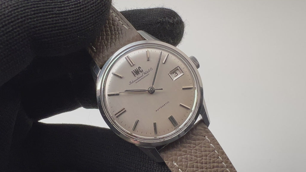 インターナショナルウオッチカンパニーの1970年製自動巻きラウンドケースです。IWCとインターナショナルウォッチカンパニーの筆記体の両方に表記されている人気モデルです。ペラトン式自動巻きの完成形Cal.8541B搭載でオールドインターらしいシンプルで質実剛健なモデルです。シンプルだからこそ造りの良さが感じられます。シルバー文字は大きなダメージのない良いコンディションです。ケースは小傷がありますが、過度な仕上げを感じない状態です。ベルトは社外の革ベルトが取り付けられています。