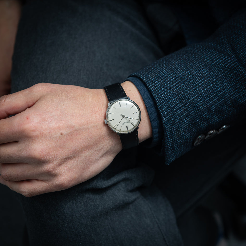 IWC ラウンドケース 1961年製 Cal.401です。当時としては最新の薄型高級ムーブメントCal.401を搭載したラウンドモデルです。文字盤は表面の荒れが見られますが目立つシミ等無く綺麗です。ケースは小傷が見られますが大きなダメージはありません。ベルトは社外の革ベルトが取り付けられています。