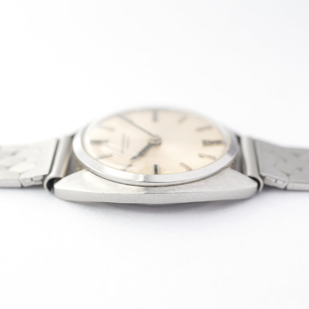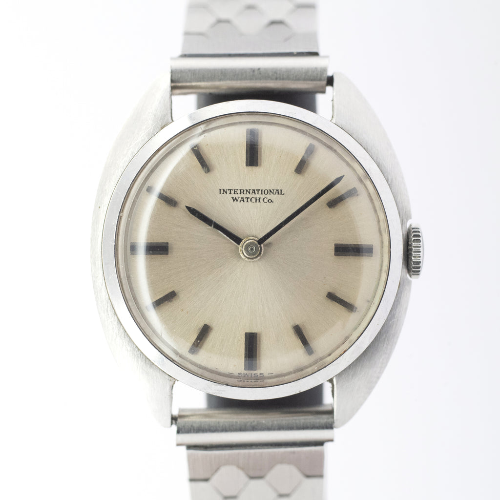 インターナショナルウオッチカンパニーの1969年製レディースウォッチです。この年式の時計に多いトノーケースで約24㎜と可愛いいサイズでシンプルなIWCらしい時計です。ケースは小傷が見られますが大きなダメージはありません。文字盤はシミ等なく綺麗です。手巻きや針回しの操作はスムースです。
