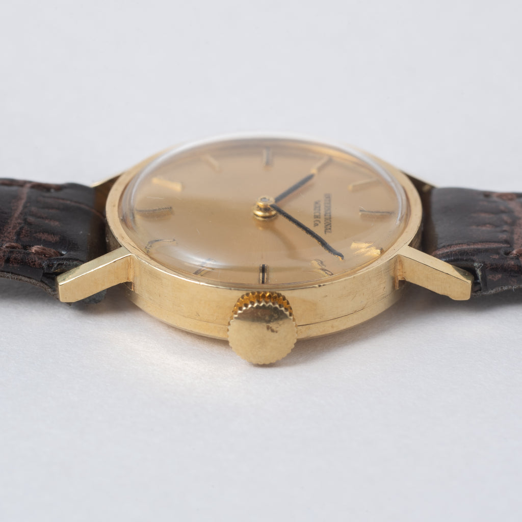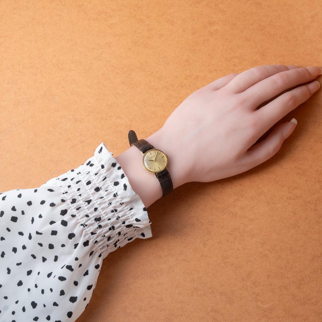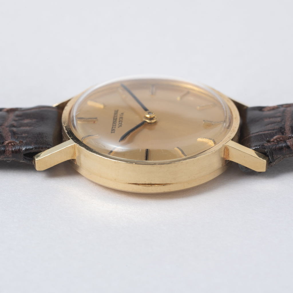 1960年代製のIWCレディース18金無垢手巻きモデルです。ラウンド状の18金無垢ケースでケース経21mmの可愛らしい時計です。文字盤もシャンパンゴールドで高級感を感じます。ムーブメントは手巻きのCal.41を搭載。ケースは小傷はございますが大きなダメージはございません。ケースは18KYG製で裏ブタ(内側)に刻印が確認できます。手巻きや針回しの操作はスムースです。ベルトは新品社外の革ベルトが取り付けてあります。