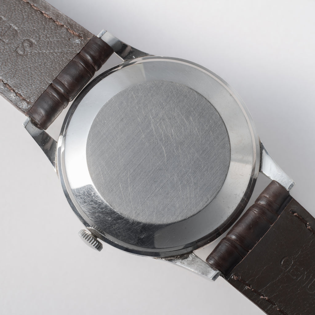 • ヴィンテージ時計の特性上、風防・パッキン・リューズ・バネ棒などの消耗部品は後年メンテナンス過程で交換されている場合がございます。オリジナル性を重視しておりますが、必要に応じて適切な部品にて調整されていますので、よりコレクション性重視のお求めのお客様は事前にご確認ください。
