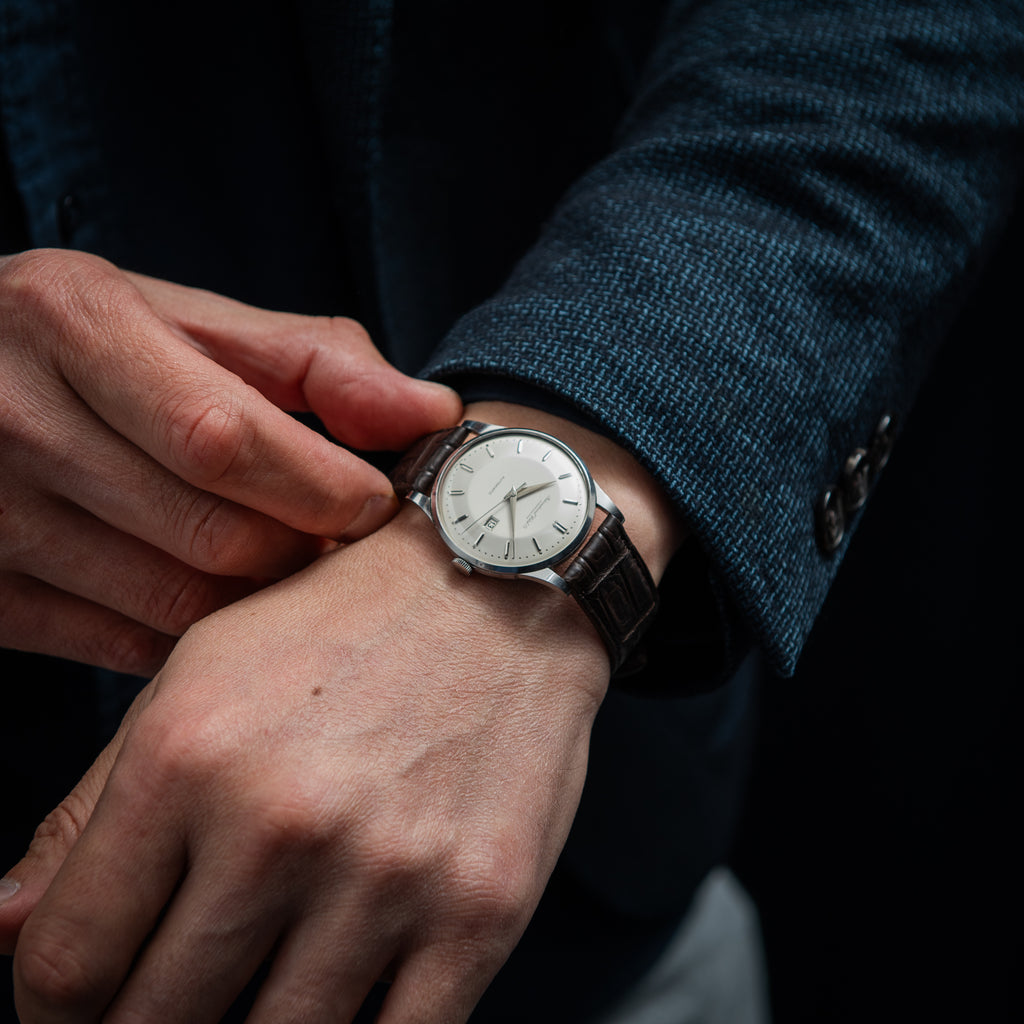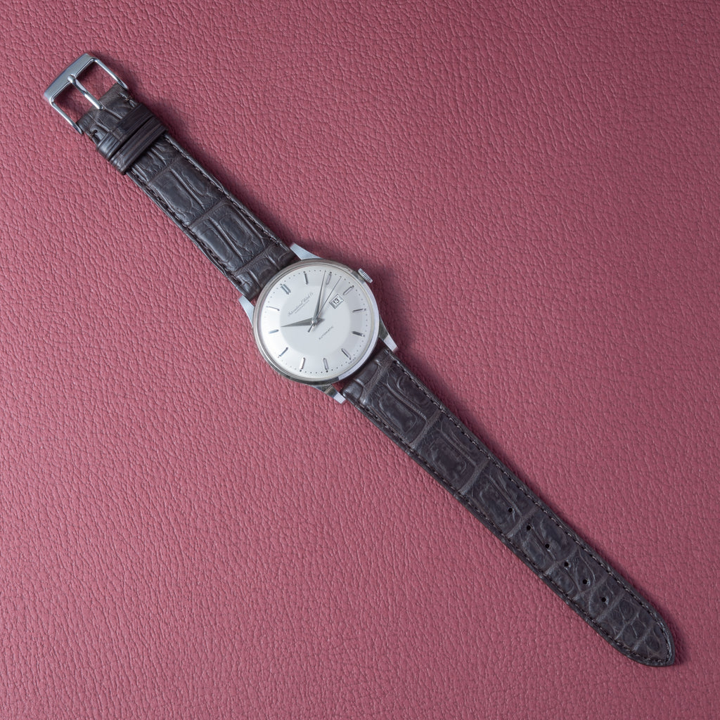 IWC ラウンドケース 1960年製/昭和35年製 寄り目 Cal.8531 砲弾インデックス プラチナケースです。非常に綺麗な文字盤で立体的なボンベダイヤル、パールドット、砲弾インデックス、寄り目とオールドインターの魅力が詰まっています。裏蓋内側にプラチナ刻印がありますがスイスホールマークがありませんので輸出先で仕立てたケースと思われます。厚みの抑えられたケースで装着感の良い1本です。ケースは小傷が見られますが大きなダメージはありません。手巻きや針回しの操作はスムースです。ベルトはファイアーキッズオリジナル、クロコダイルが取り付けられています。