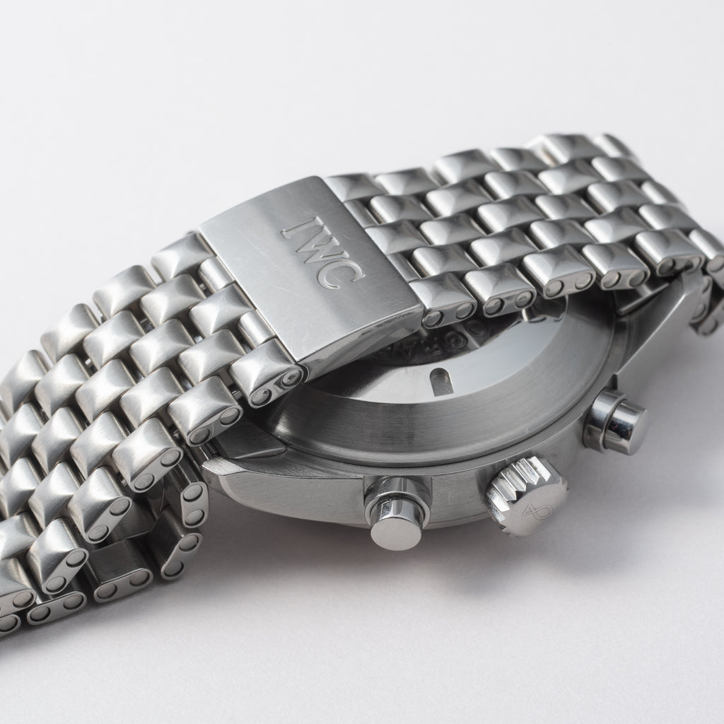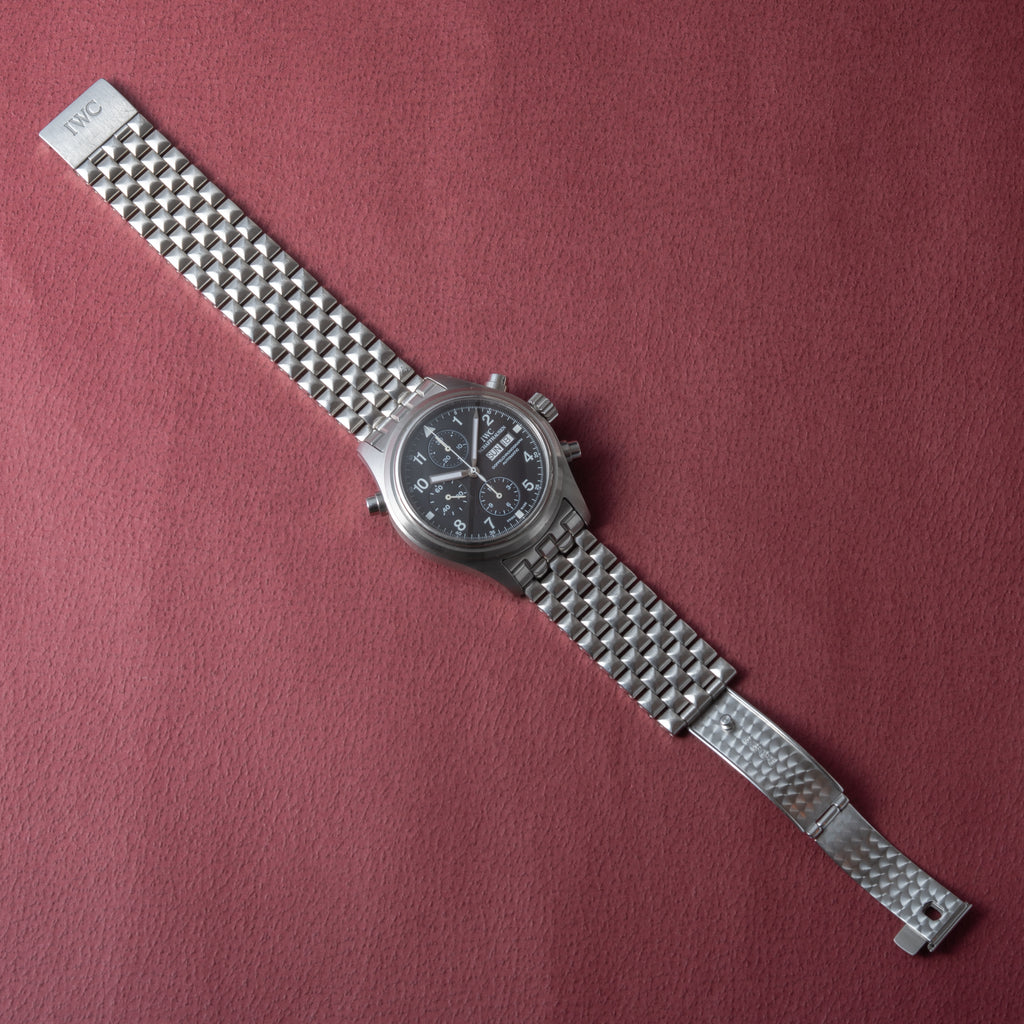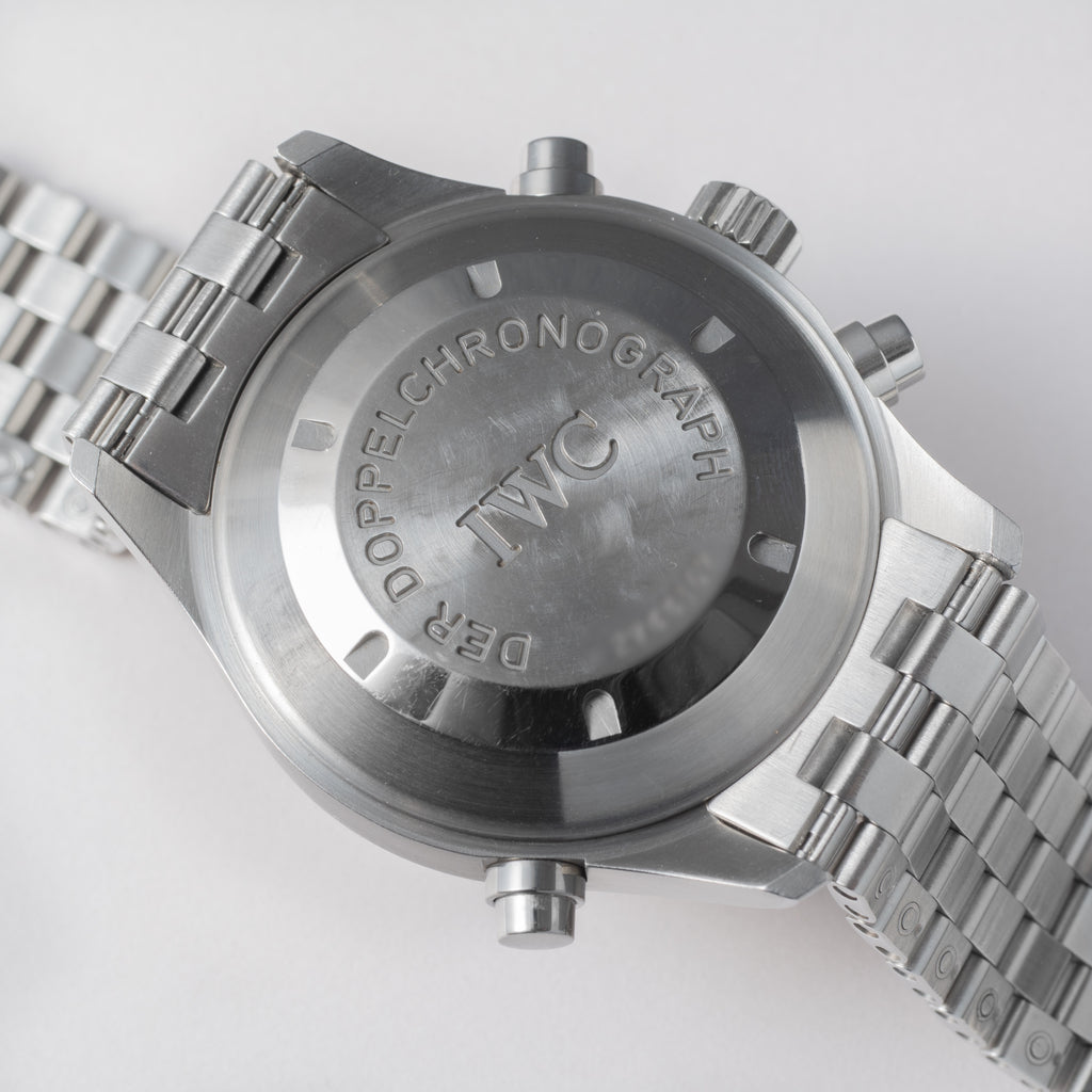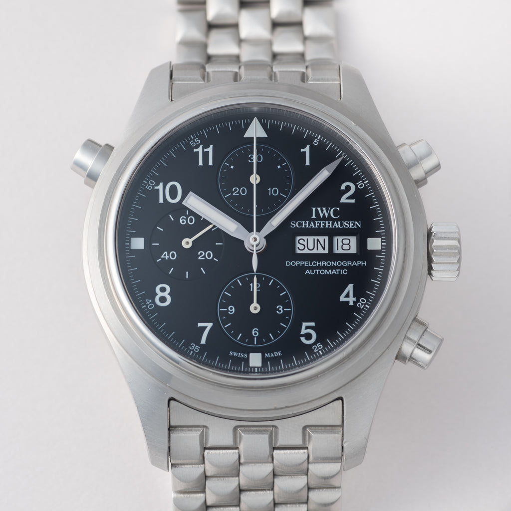 IWC ドッペルクロノグラフ Ref.IW371319 Cal.79230 オートマチック 2003年製です。マークシリーズをイメージしたパイロットミリタリーウォッチで、重厚なケースに複雑機構のスプリットセコンドクロノグラフを搭載しています。ダイヤルにはダメージは見られず、ケースも小傷のみの良いコンディションです。ムーブメントはETAベースのCal.79230搭載しており、手巻きやクロノファンクションも良好です。ベルトは純正のステンレスブレスが取り付けられています。こちらはOH済みです。箱やギャランティーが付属します。
