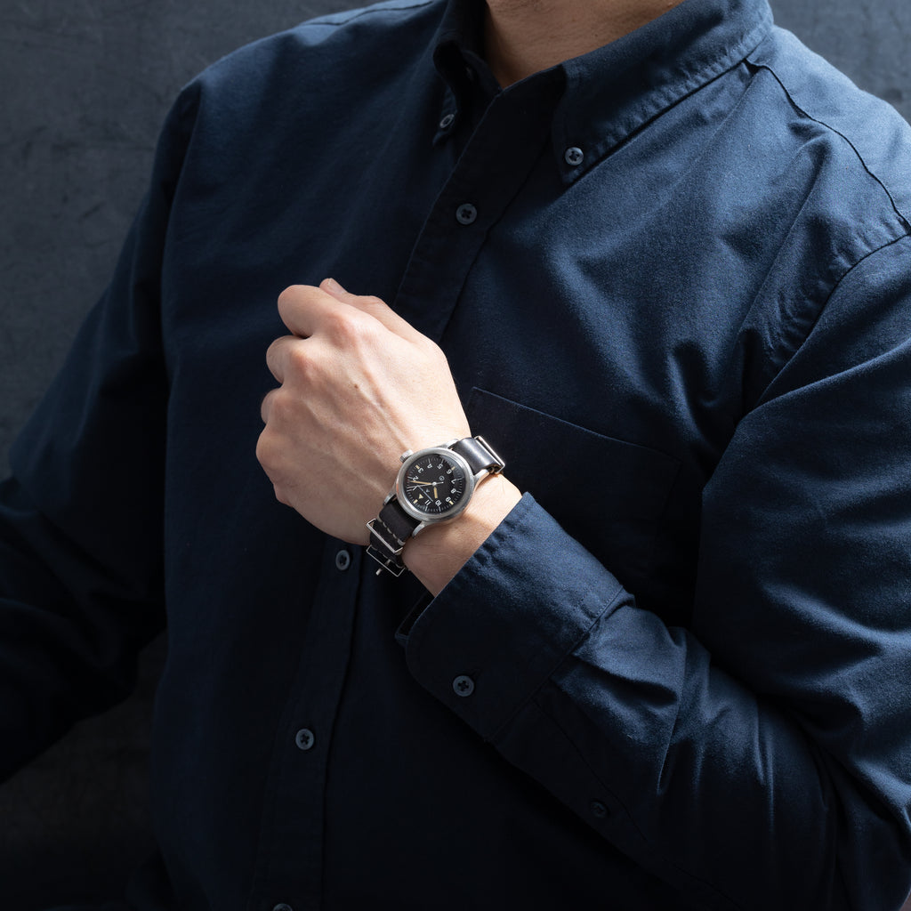 IWC マーク11 イギリス空軍パイロットウォッチ 6B/346 1952年製 Cal.89ハック付きです。こちらは1952年支給のマーク11 イギリス空軍モデルになります。ダイヤルは、貴重な7のインデックスがフックの形状の通称「フック7」になります。ブラックのマットダイヤルはダメージを感じない良いコンディションです。ケースはバックケースには多少の磨かれた印象を感じますが、ミドルケースは小傷はあるものの、磨きを感じない良いコンディションです。スクリューバックで耐磁性と防水性を高める為の2重構造のケースは厚みがある為、重厚感を感じます。ムーブメントはハック付きのCal.89を搭載、ムーブメントにもブロードアローの刻印があります。ベルトは引き通しのアキュレイトフォルムを合わせております。こちらはOH済みです。