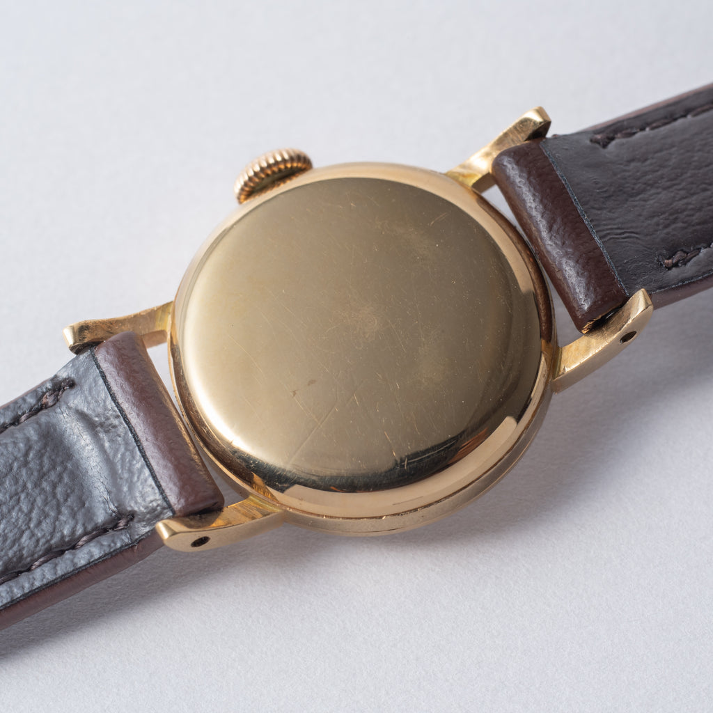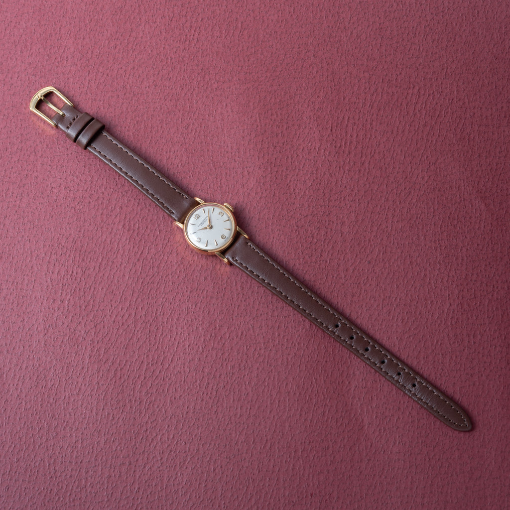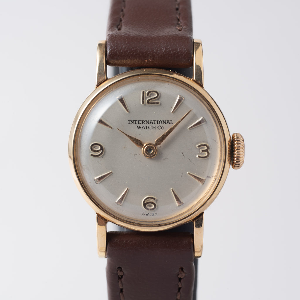 1958年製のIWCレディース18金無垢 手巻きモデルです。ラウンド状の18金無垢ケースでケース経19mmの可愛らしい時計です。シルバー文字盤は若干の小傷はございますが、経年変化などは感じないコンディションです。ケースは小傷はございますが大きなダメージはございません。ケースは18KYG製で裏ブタ(内側)に刻印が確認できます。ムーブメントは手巻きのCal.41を搭載。手巻きや針回しの操作はスムーズです。ベルトは社外の革ベルトが取り付けてあります。