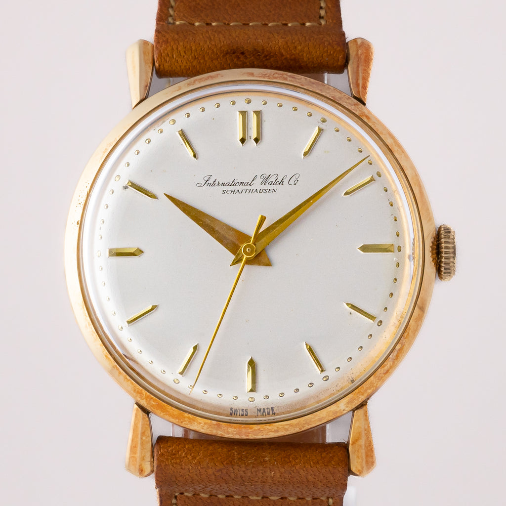 インターナショナルウォッチカンパニーの1957年製18金無垢ケースです。名作キャリバーCal.89を搭載したシンプルなモデルです。シンプルだからこそ造りの良さが感じられます。ケースはスイスの刻印はありませんので輸出先の国で仕立てた18金無垢ケースになります。ケースは小傷が見られますが大きなダメージはありません。手巻きや針回しの操作はスムースです。革ベルトはヴィンテージモデルに相性抜群な「Accurate Form(アキュレイトフォルム)」のレザーベルトを装着しています。