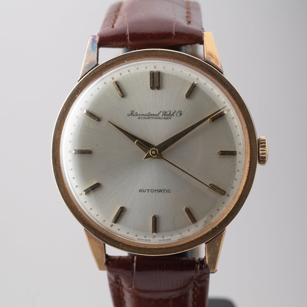 1967年製のインターナショナルウオッチカンパニー18金無垢モデルです。スッキリとしたデザインにノンデイトで使いやすいモデルです。ムーブメントはペラトン式自動巻き上げ機構のCal.854を搭載。文字盤はよく見ると表面に荒れが確認できます。ケースは輸出仕様に見られる社外の18Kイエローゴールド製で小傷はございますが大きなダメージはございません。手巻きや針回しの操作はスムースです。ベルトは新品のカーフが取り付けてあります。手巻きや針回しの操作はスムースです。