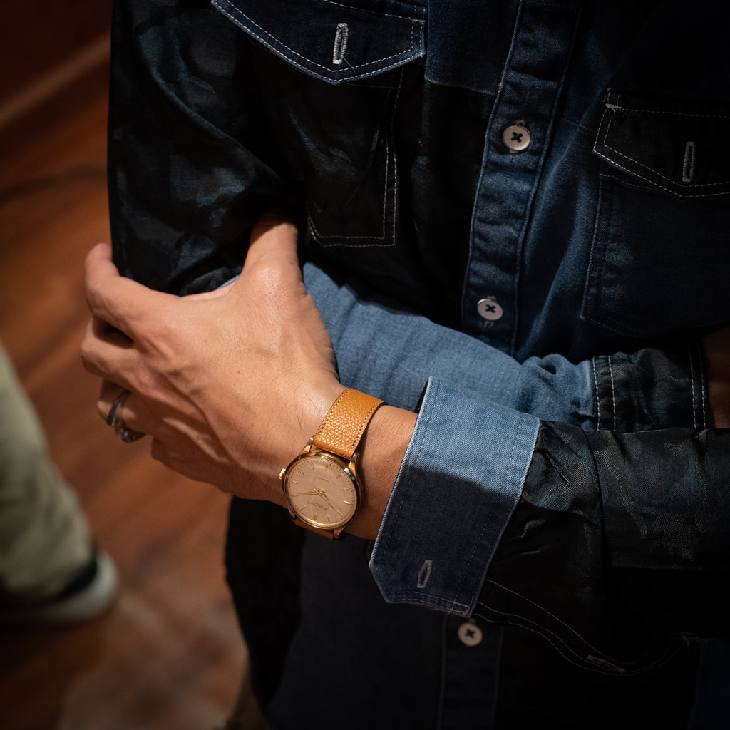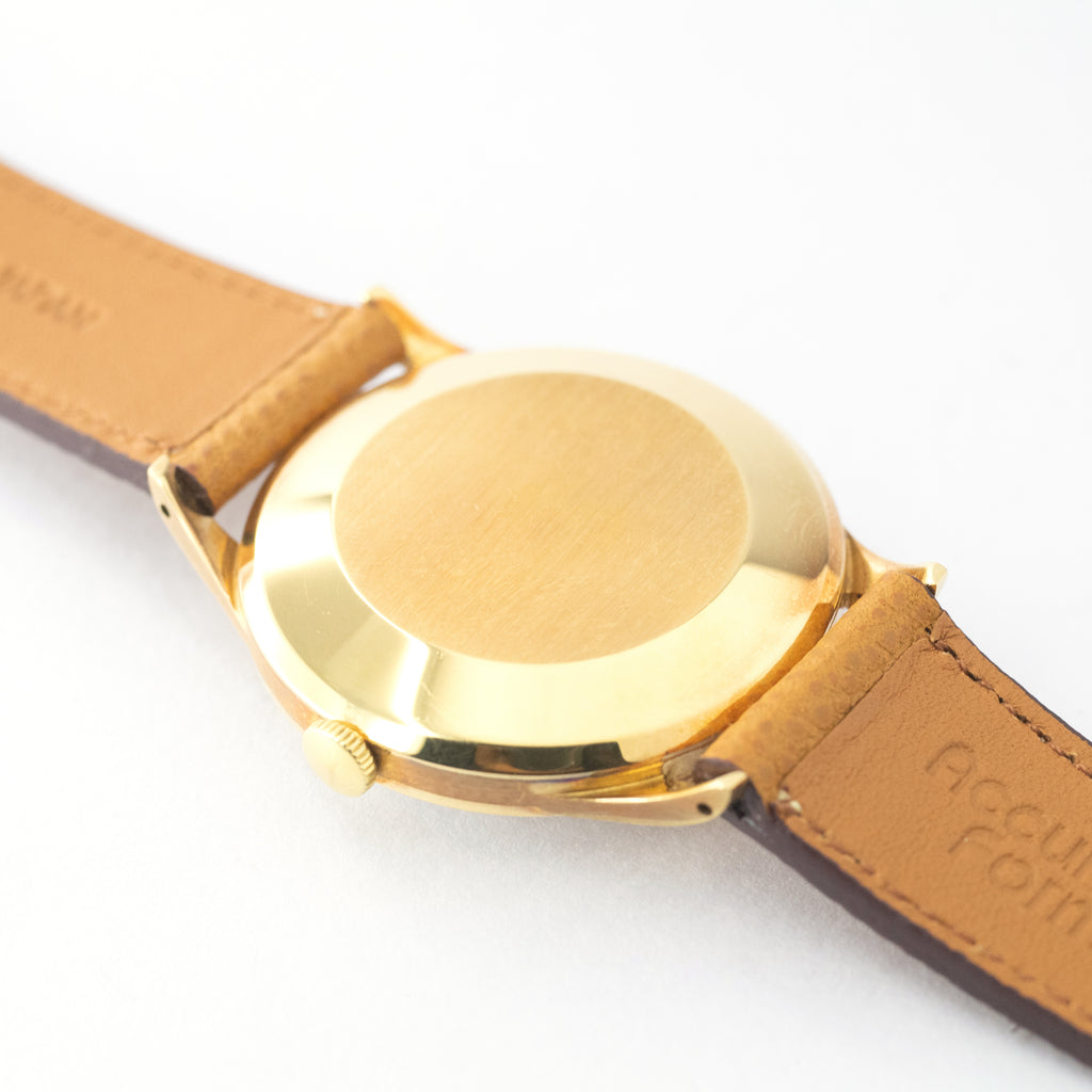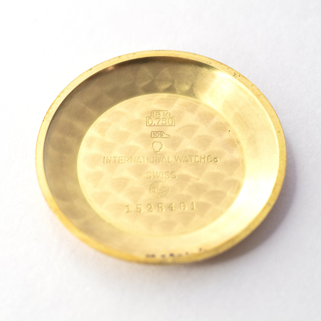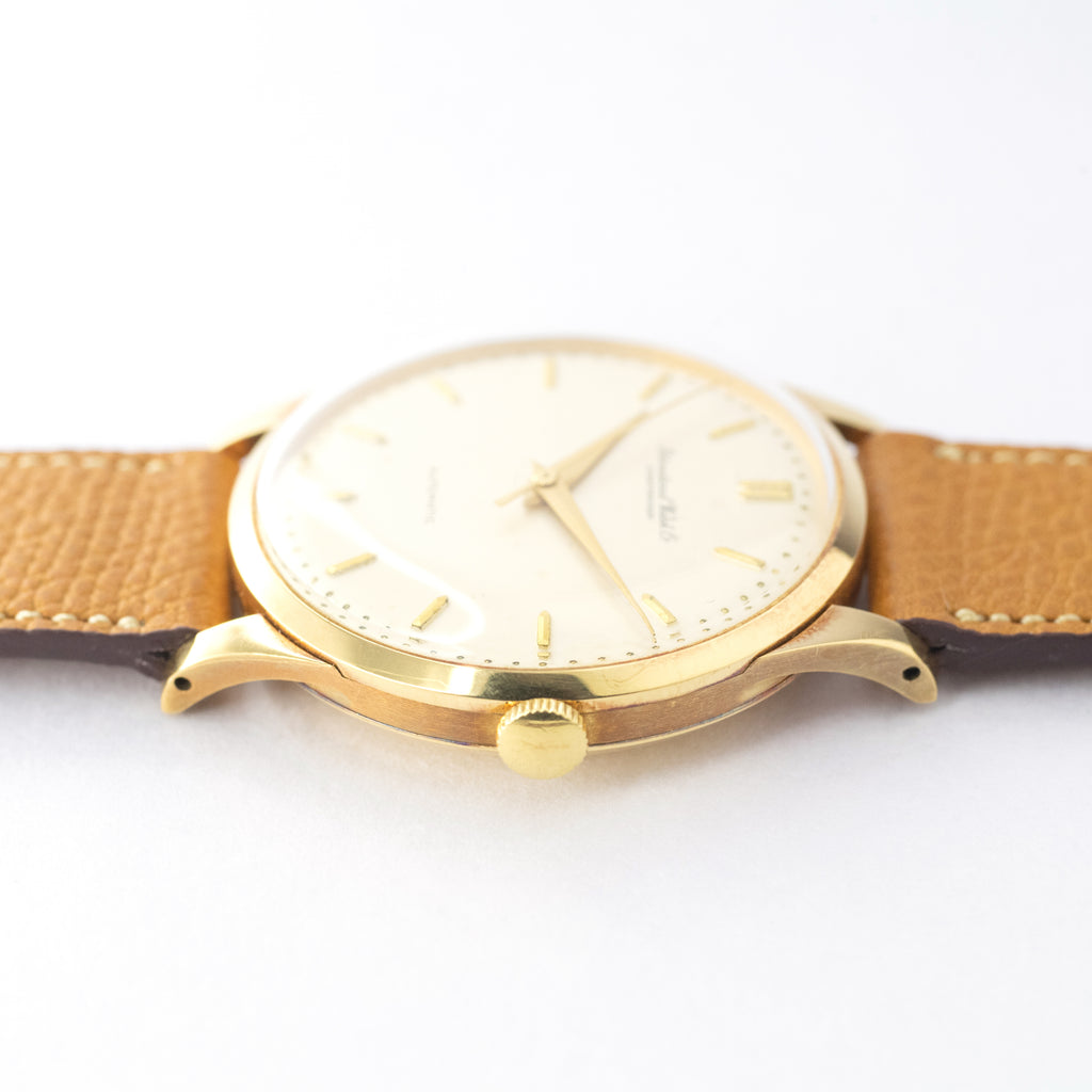 1961年製のIWCオートマチックモデル18KYGモデルです。IWCらしいシンプルなデザインの金無垢モデルですがアイボリー文字盤なのでそこまでの派手さは無く、上品かつクラシカルな印象のオールドインターです。文字盤は多少経年なりの劣化はございますがこの年代のIWCとしては比較的キレイな状態を保っています。ケースは18金無垢製で裏ブタ(内側)に刻印が確認できます。ムーブメントはぺラトン式巻き上げ機構のCal.853を搭載、仕上げもキレイでさすがIWCといったところです。手巻きや針回しの操作はスムースです。ヴィンテージモデルに相性抜群な「Accurate Form(アキュレイトフォルム)」のレザーベルトを装着しています。
