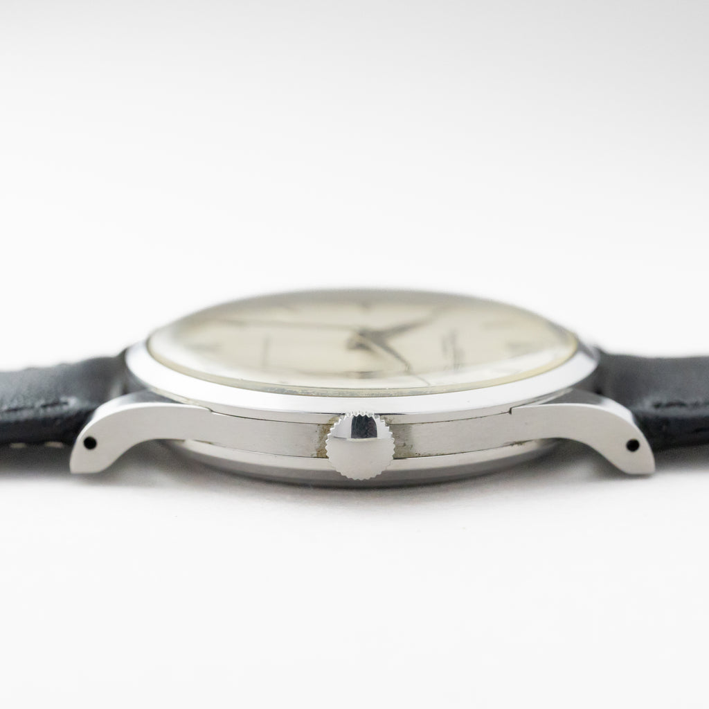 1962年製のインターナショナルです。奇をてらわないシンプルなデザインはインターナショナルの代名詞でもあり、真摯な時計作りはビギナーからマニアまで幅広い人気があります。ダイヤルは過去にリダンされたものではあるものの、オリジナルへの忠実な再現の度合いはとても高いレベルです。