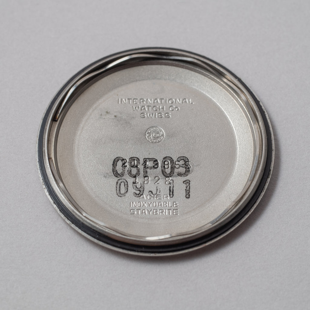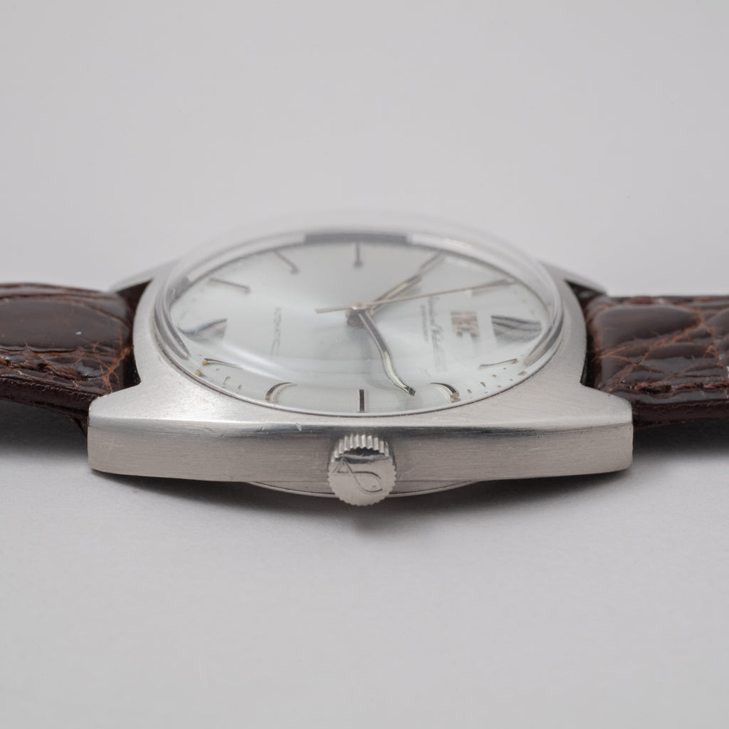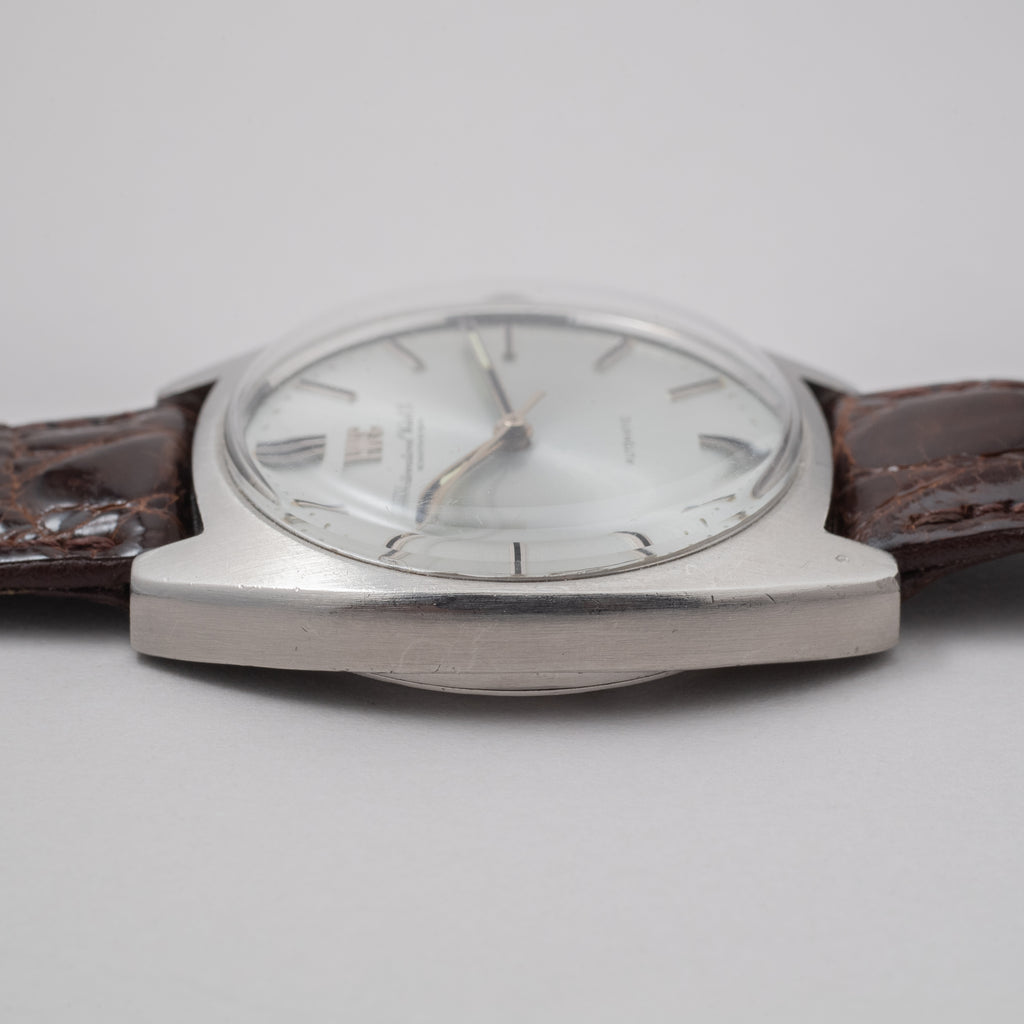 インターナショナルウォッチカンパニーの1973年製トノーケース自動巻きです。ペラトン式自動巻きの後期型Cal.854Bを搭載したモデルでこの年式では珍しいノンデイトが魅力的です。お魚リューズが付いた防水ケースを採用しています。ケースは小傷が見られますが大きなダメージはありません。文字盤も目立つ劣化はありません。手巻きや針回しの操作もスムースです。革ベルトは社外の未使用品が取り付けられています。