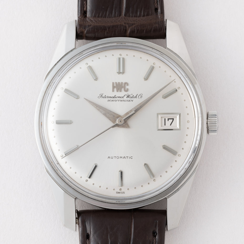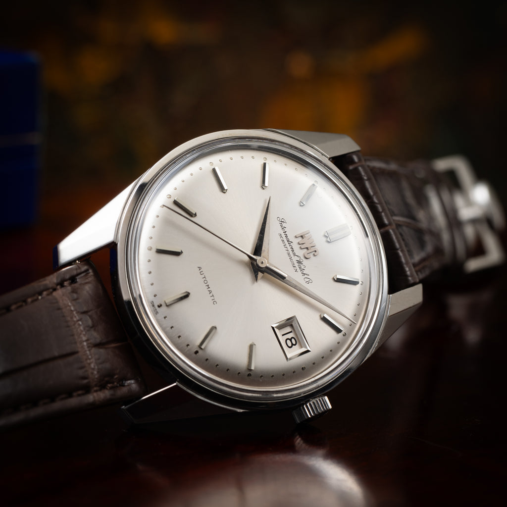 インターナショナルウオッチカンパニーの1972年製 自動巻きラウンドケースです。ペラトン式自動巻きの完成形Cal.8541Bを搭載したモデルでオールドインターらしいシンプルな質実剛健なモデルです。シンプルだからこそ造りの良さが感じられます。サンバースト仕上げの文字盤は非常に綺麗な状態です。36mmと存在感のあるケースは小傷がありますが大きなダメージはありません。ベルトは社外のクロコダイルベルトに純正尾錠が装着されています。