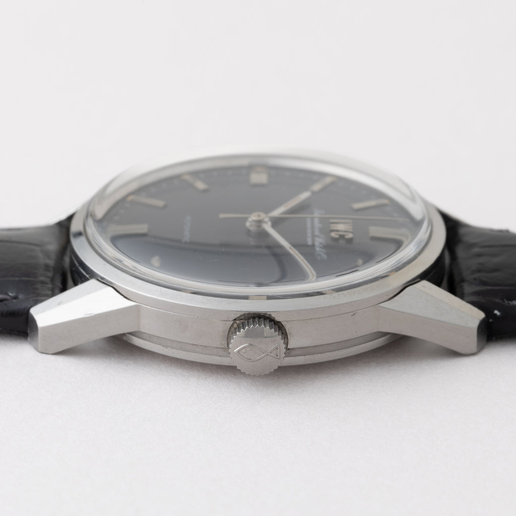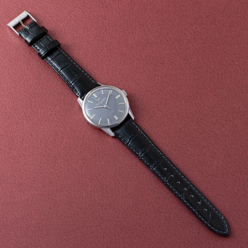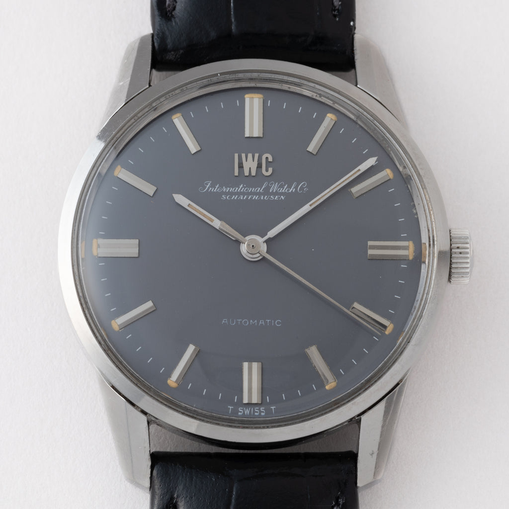 インターナショナルウオッチカンパニーの1969年製自動巻きノンデイト ラウンドケースです。IWCとインターナショナルウォッチカンパニーの筆記体の両方に表記されている人気モデルです。ペラトン式自動巻きの完成形Cal.854B搭載でオールドインターらしいシンプルな質実剛健なモデルです。シンプルだからこそ造りの良さが感じられます。グレー文字は大きなダメージのない良いコンディションです。ケースは小傷がありますが、過度な仕上げを感じない状態です。ベルトは社外の革ベルトに純正尾錠が取り付けられています。