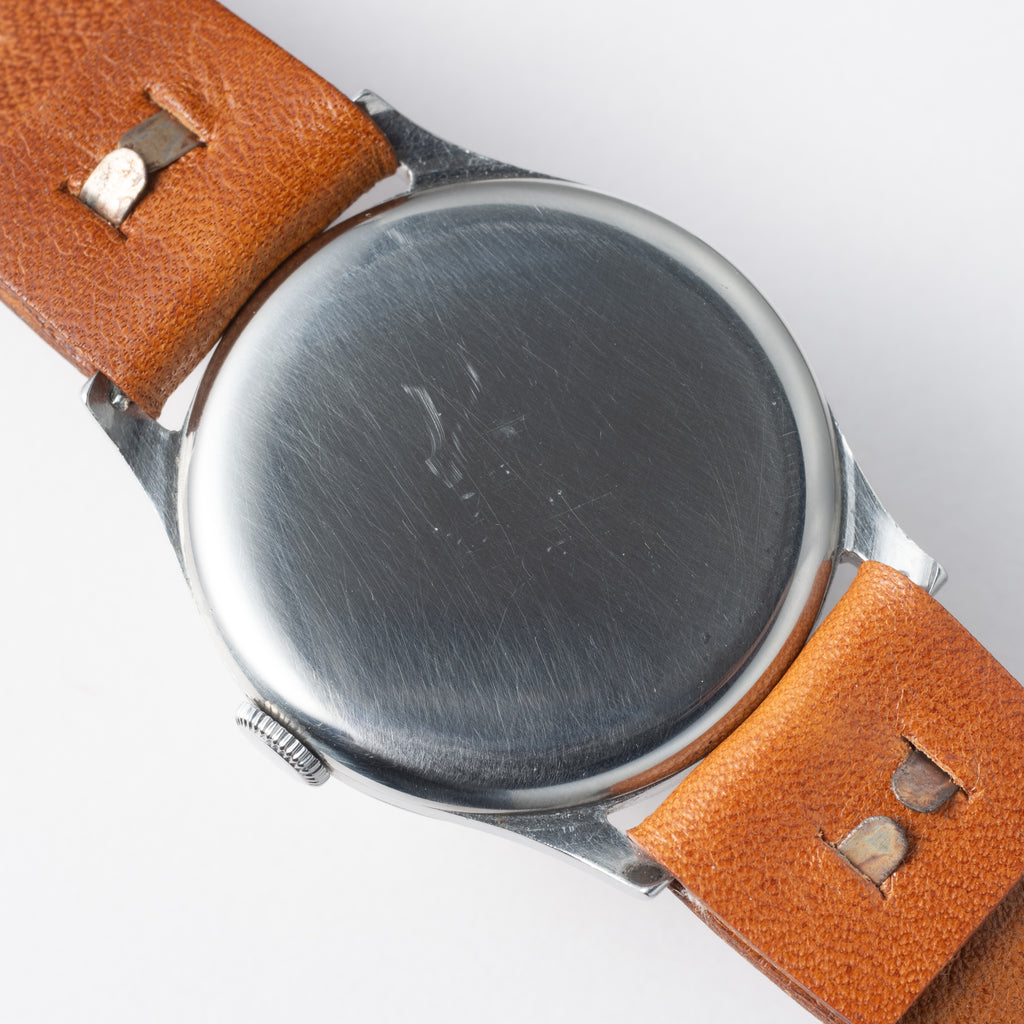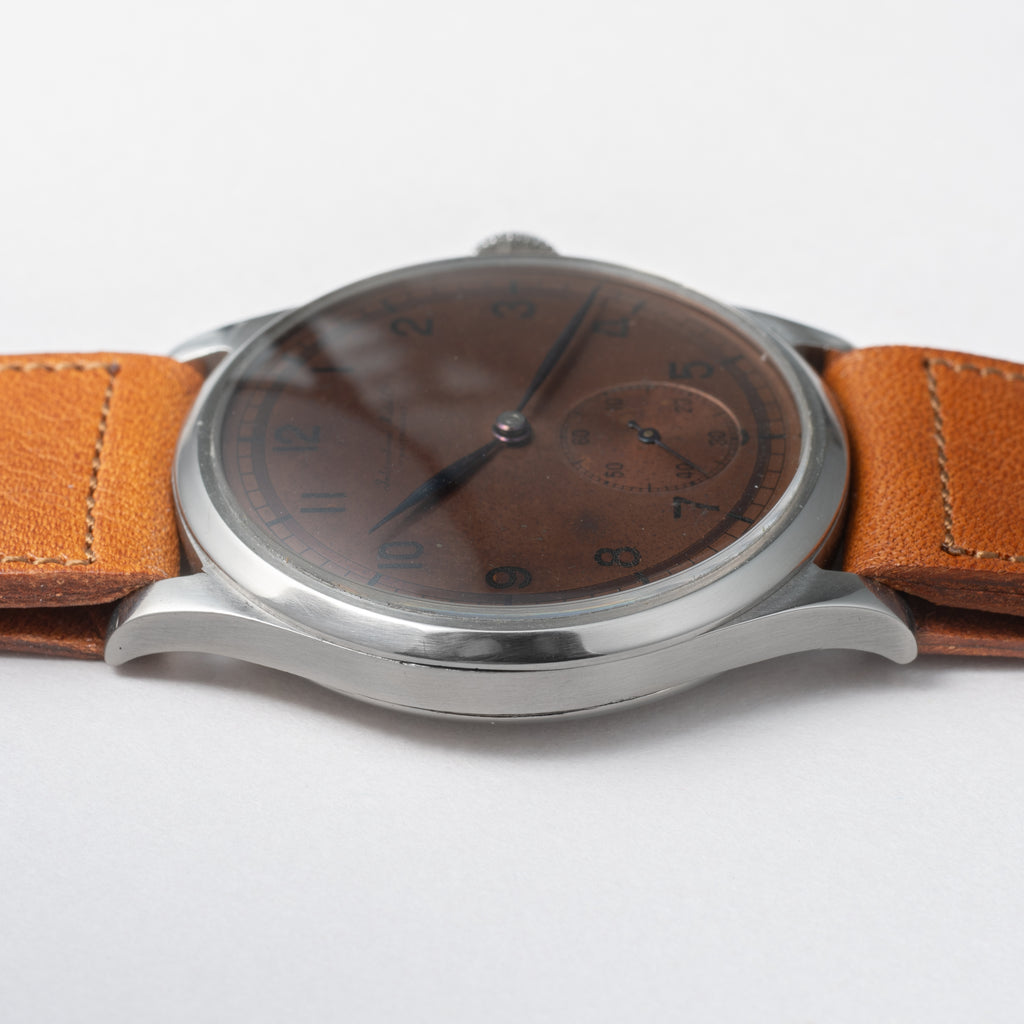 1938年製のIWC アラビアインデックス コッパーダイヤルです。30年代のCal.83搭載モデルの中でもケース径35mmは大振りで、貴重なケースサイズです。コッパーダイヤルは経年変化で色味が濃くなっており、唯一無二の表情になっています。ケース全体に若干の仕上げを感じますが、雰囲気を損なう様なものではありません。ムーブメントはCal.83を搭載、手巻きや針回しはスムーズです。ベルトはアキュレイトフォルムを装着しています。