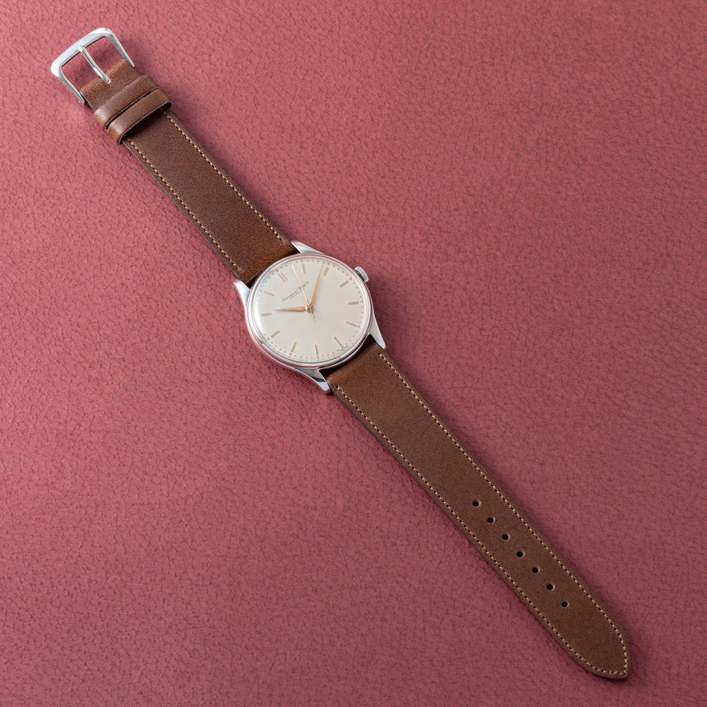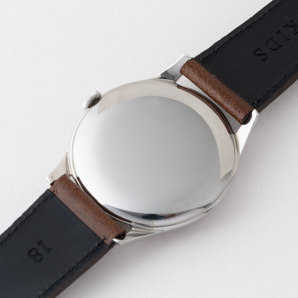 オールドインター 名作キャリバー89搭載1955年製ステンレスケースです。少しくすんだシルバーダイヤルに金色インデックス、針がお洒落です。シンプルなデザインだからこそ造りの良さが感じられる1本です。ケースは小傷がありますが大きなダメージはありません。文字盤は全体的に退色して良い雰囲気になっています。手巻きや針回しの操作はスムーズです。ベルトは新品のファイアーキッズオリジナル革ベルトで、イタリアンレザーのブッテーロに、裏面はラバーが取り付けられています。こちらはオーバーホール済みです。