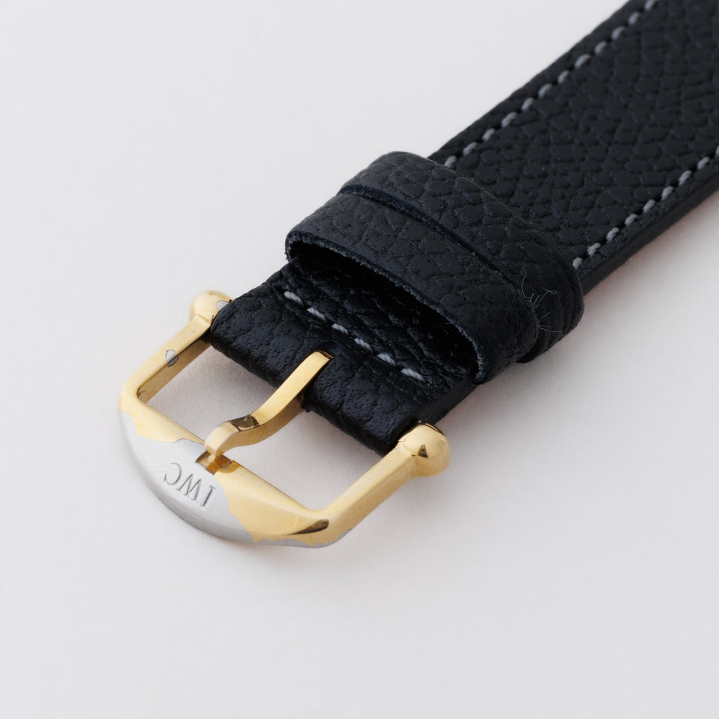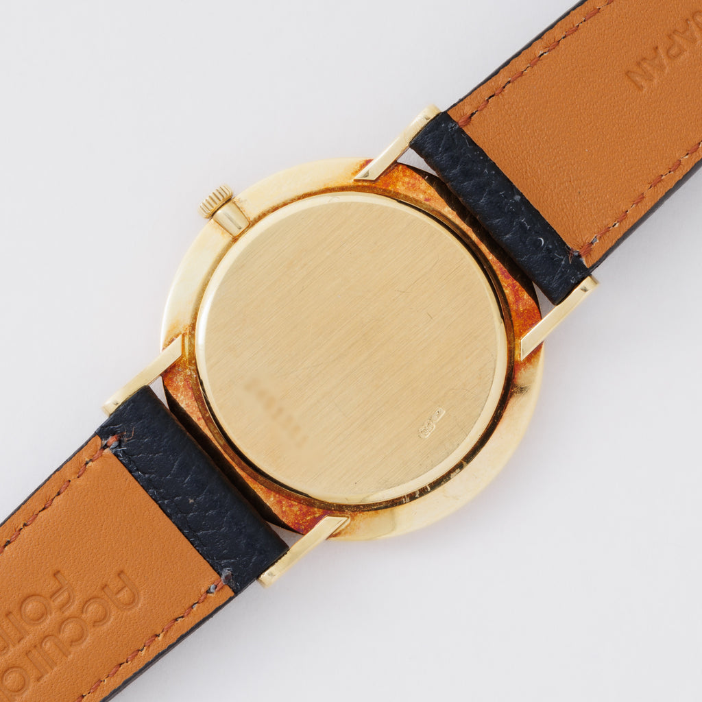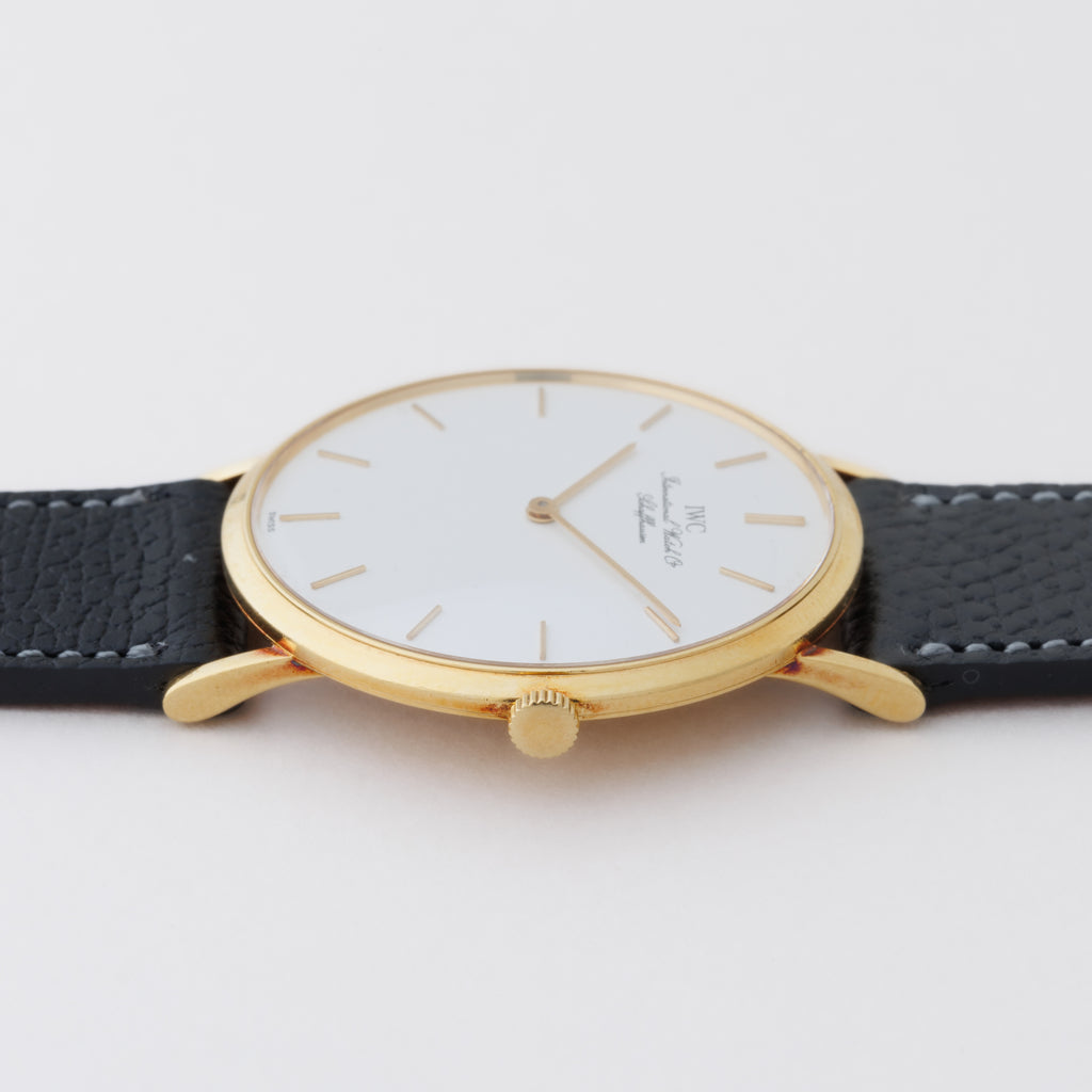 IWC 18金無垢ラウンドケース Ref.2010 1991年製 手巻き Cal.185純正尾錠付きです。シンプルな18金無垢薄型ラウンドケースにバーのインデックス、針の組合せはバウハウスらしい、IWCらしい1本になっています。文字盤は透明感のあるエナメル仕上げでひび割れ等無く綺麗です。ケースも余り使用感が無く小傷は見られますが良い状態になります。手巻きや針回しの操作はスムースです。ベルトはヴィンテージと相性の良いアキュレイトフォルムで剥がれがありますが純正尾錠が取り付けられています。