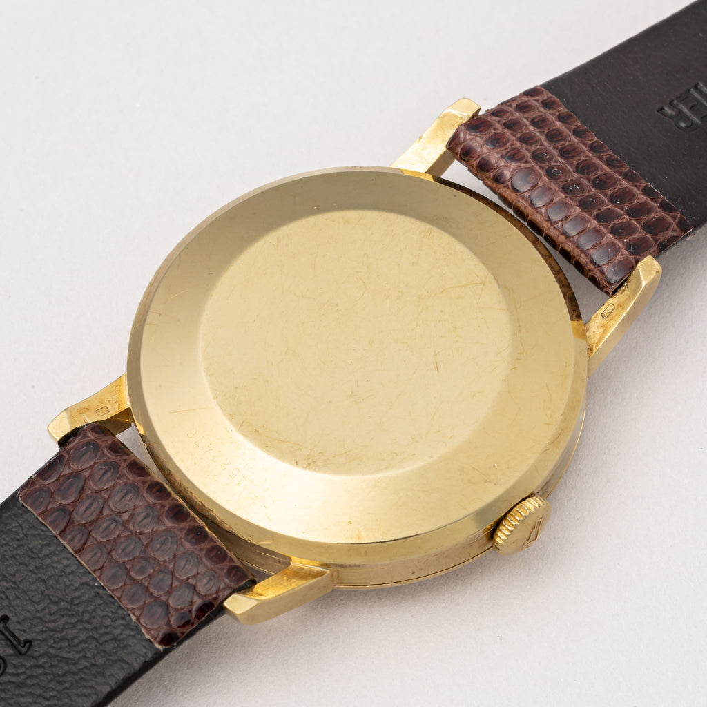 IWCのラウンドモデル、1960年製/昭和35年製になります。ダイヤルは大胆にカットされた植字のインデックスにパールドットのミニッツ、筆記体表記のメーカー名とクラシカルな印象です。ムーブメントは名機のCal.8531を搭載し、通称“寄り目”と呼ばれるデイト表記が内側に寄った仕様となっています。ケースは18YGで、小傷はあるものの目立つ傷はございません。リューズも古いタイプのお魚リューズが付いています。ベルトは社外の革ベルトが取り付けられています。こちらはOH済みです。