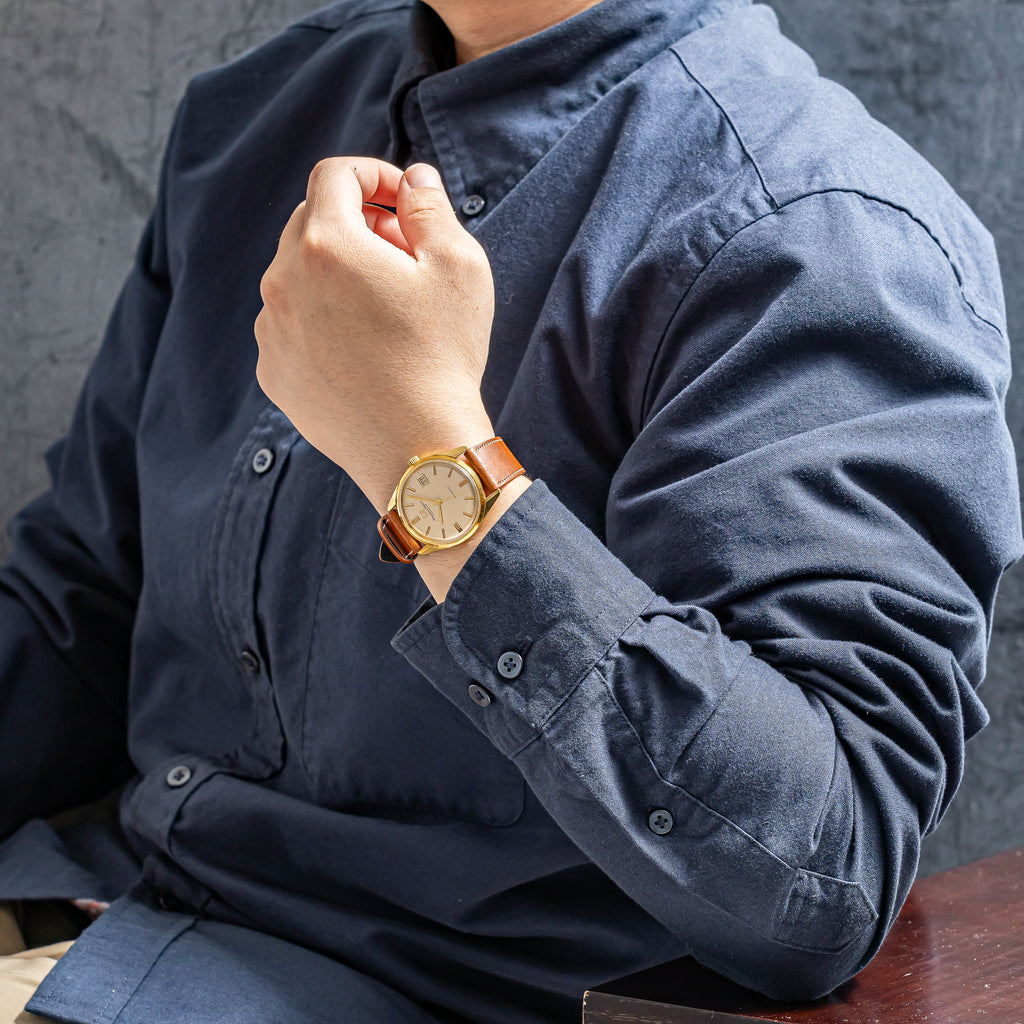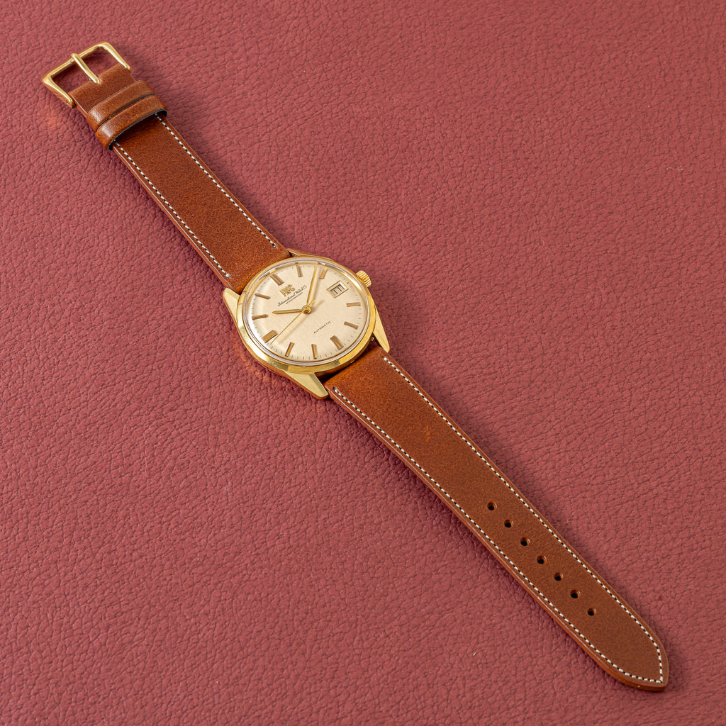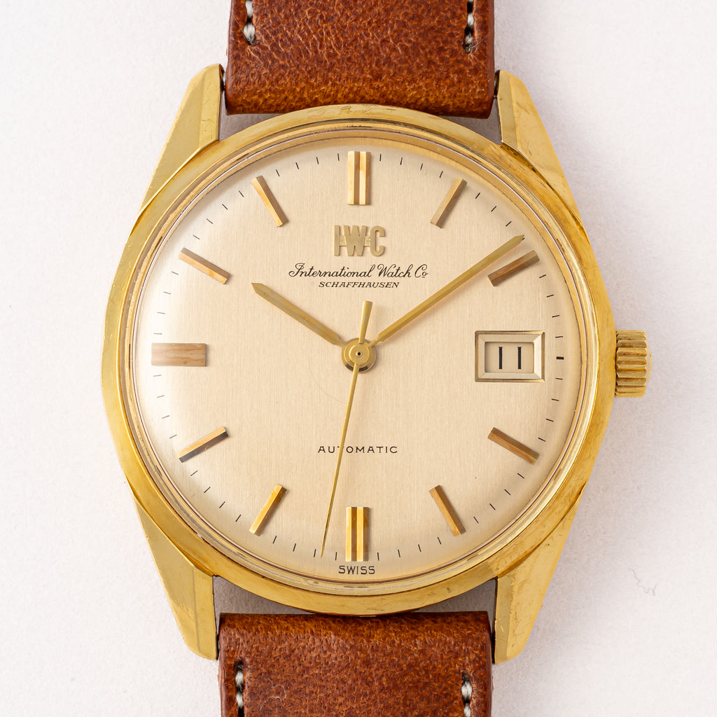 インターナショナルウオッチカンパニーの1970年製/昭和45年製 自動巻き 18KYGケースです。スタンダードなモデルであるRef.810の金無垢ケース仕様という位置づけで、ステンレスケースとは違った特別感があります。シャンパンカラーの文字盤は、IWCとインターナショナルウォッチカンパニーの両方が表記されており、コンディションも良好です。18KYGのケースは全体に小キズはありますが、オリジナルのシェイプが残る自然な状態です。ムーブメントはペラトン式自動巻きの完成形Cal.8541Bを搭載。ベルトはファイアーキッズオリジナルのブッテーロレザーを合わせています。