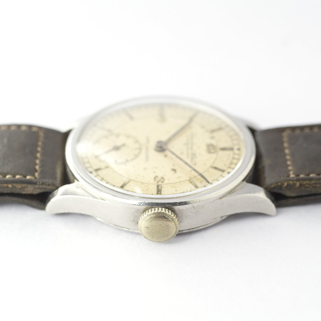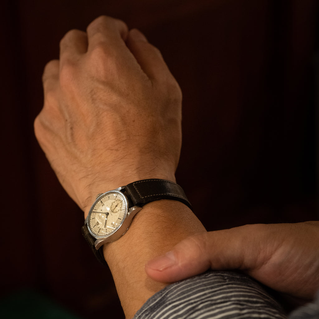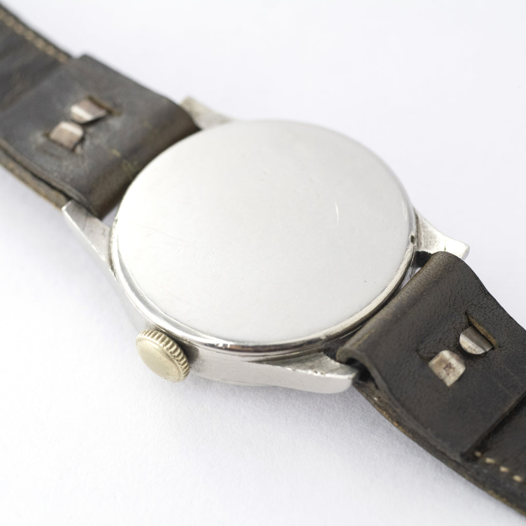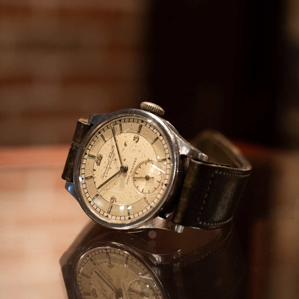 インターナショナルウォッチカンパニーの1937年製Cal.83搭載セクターダイヤルです。30mmのカラトラバタイプのケースで綺麗とは言えませんが抜群の雰囲気のセクターダイヤルです。ムーブメントは仕上がりが良く非常に綺麗な逸品です。裏蓋はスクリューバックケースになっています。小キズが見られますが大きなダメージはありません。ヴィンテージモデルに相性抜群な「Accurate Form(アキュレイトフォルム)」のレザーベルトを装着しています。