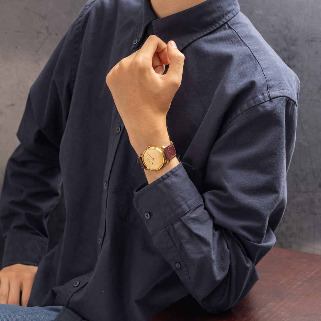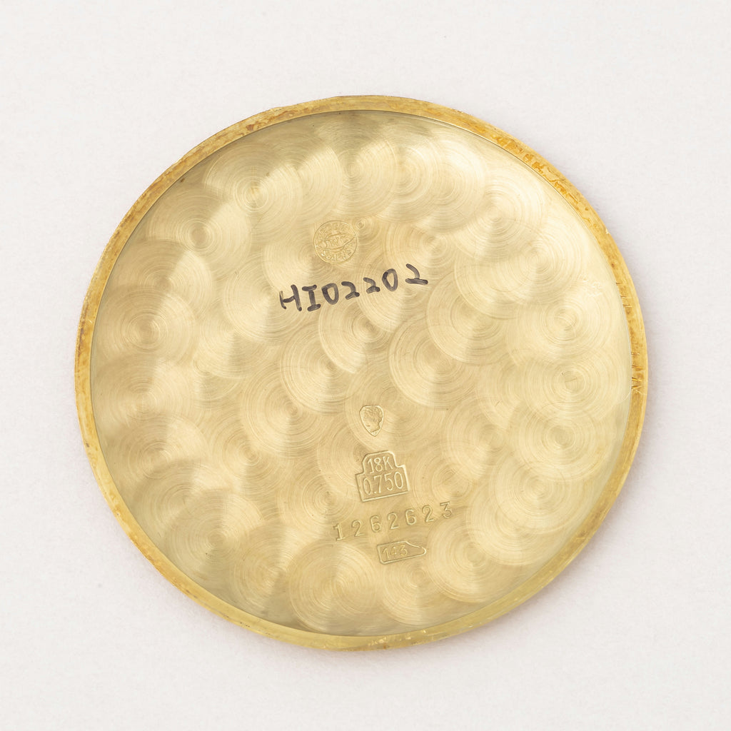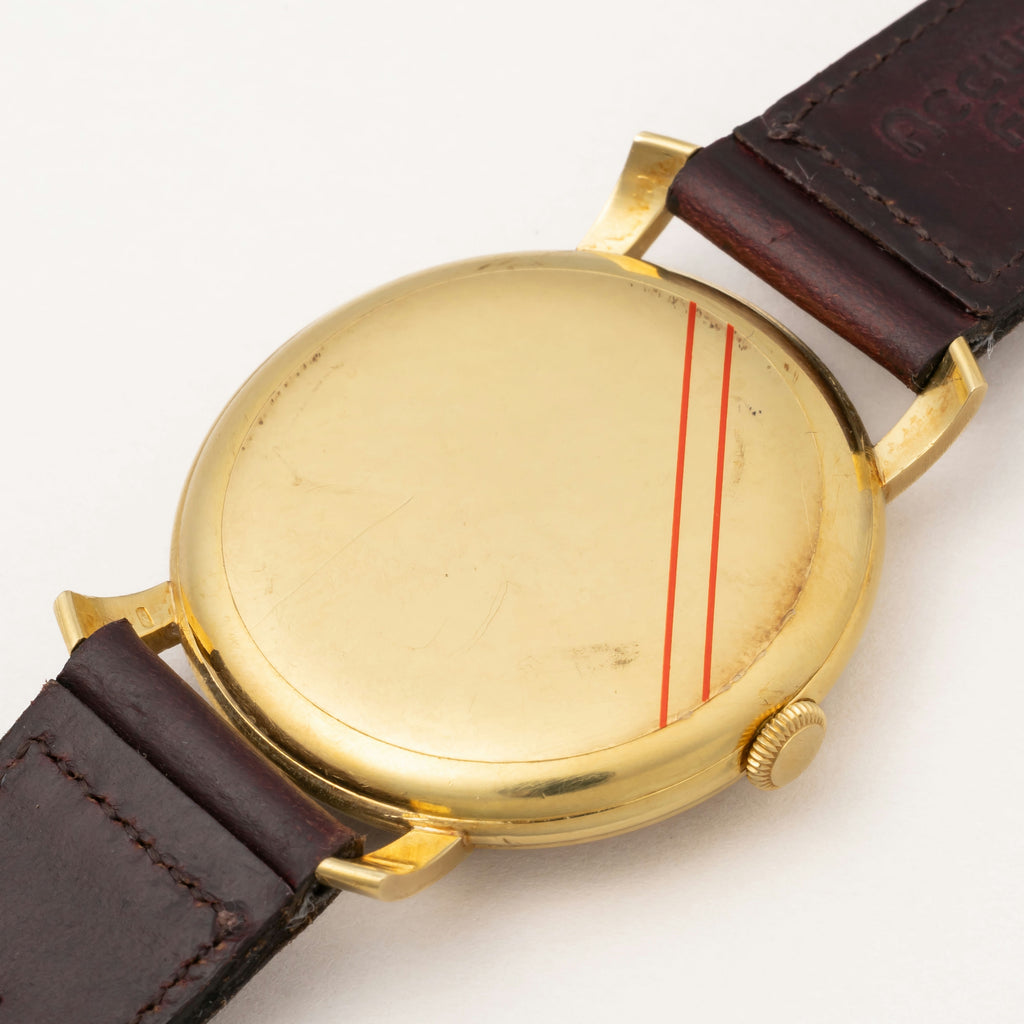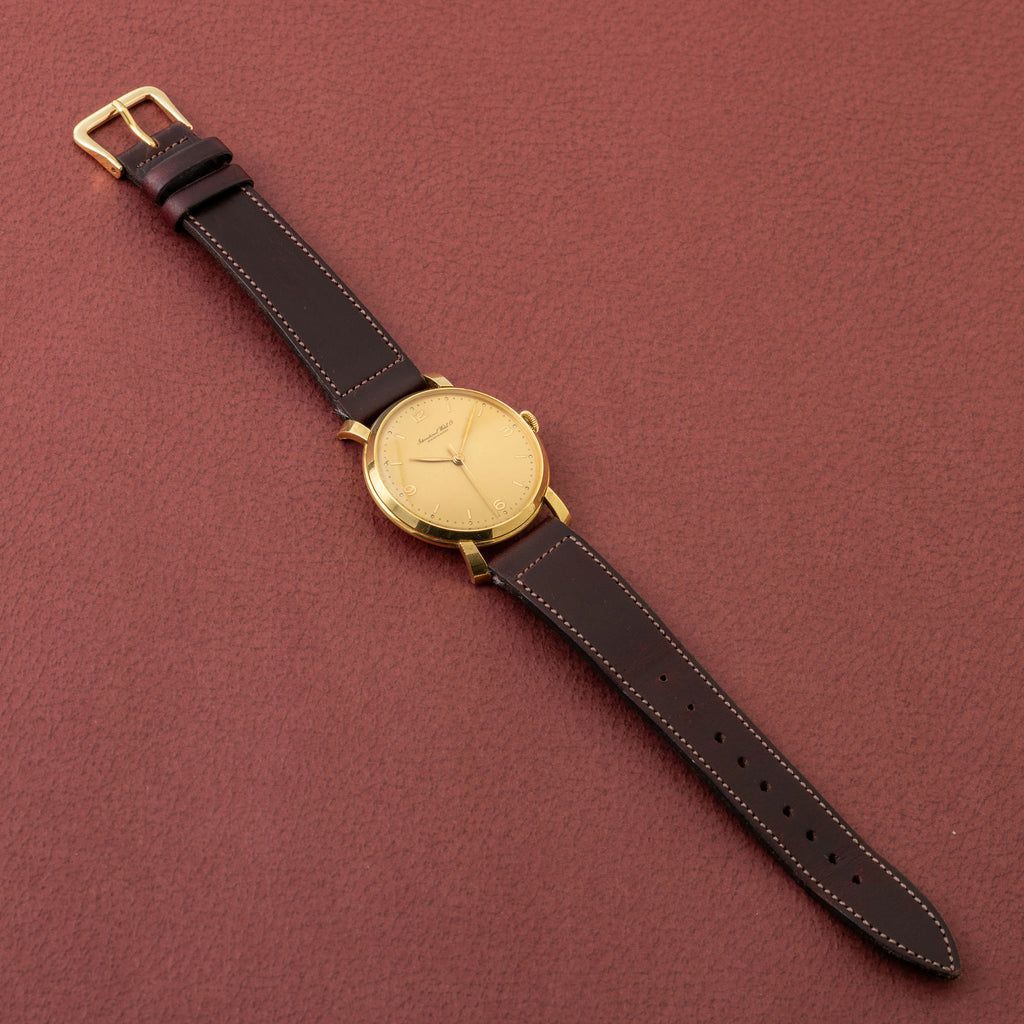 インターナショナルウォッチカンパニーの18金無垢Cal.89搭載モデル1951年製です。18金無垢ケースは幅36mmと当時としては大きく存在感があります。シャンパンゴールドの文字盤も上品で12.3.6.9のアラビア数字も印象的です。ケーキは小キズが見られますが大きなダメージ無く良い状態です。文字盤は表面の荒れが見られますが肉眼では綺麗です。ムーブメントは流石インターと思える綺麗さです。手巻きや針回しの操作もスムースです。ヴィンテージモデルに相性抜群な「Accurate Form(アキュレイトフォルム)」のレザーベルトを装着しています。