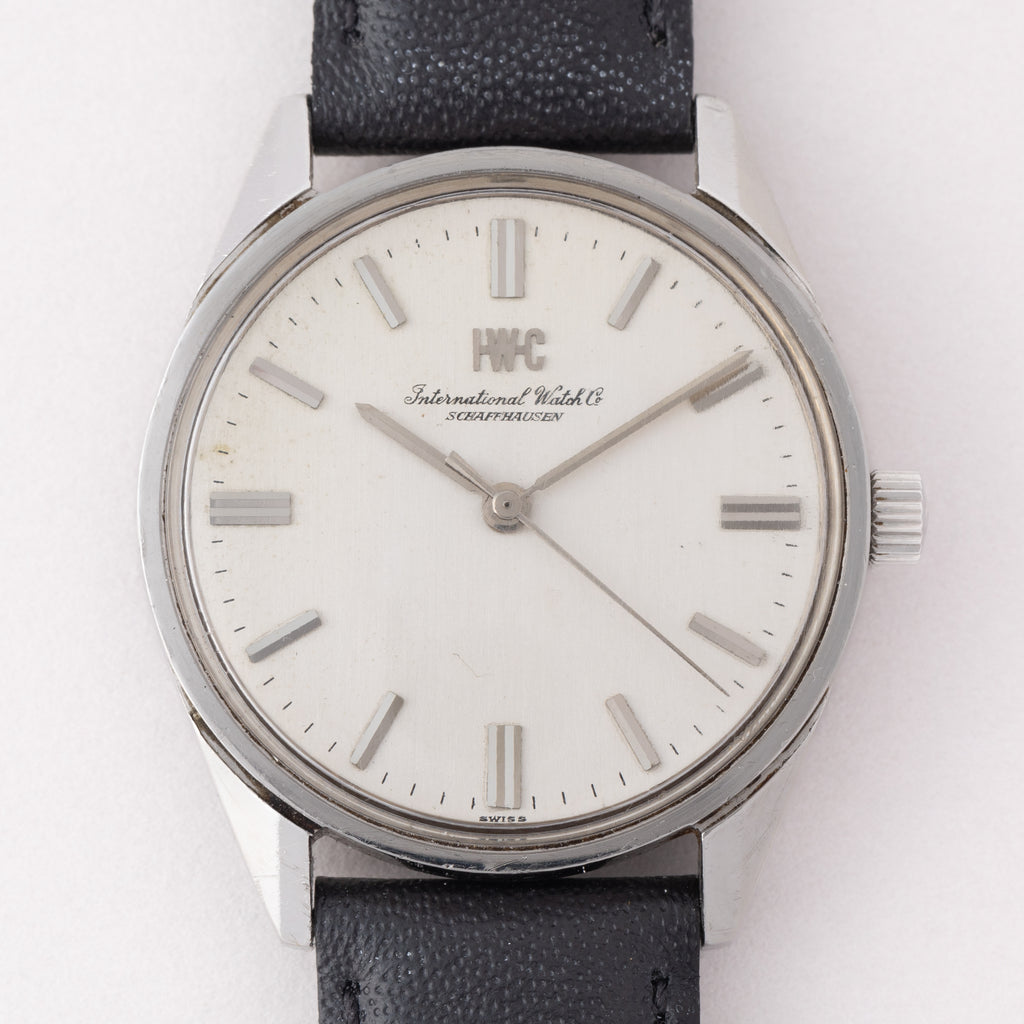 1970年製のインターナショナルウオッチカンパニー ラウンド手巻モデルです。搭載キャリバーはマークⅪ等の採用でも有名な手巻の名機Cal.89。ケースはシンプルなラウンド型で、ラグは70年代のカーデザインを彷彿とさせる直線デザインです。サイズは35mmとカジュアル・ビジネス共に使いやすいサイズ。全体に小傷が見られますが、その分磨きの入った形跡は感じません。文字盤は少し経年が見られますが大きなダメージはございません。ベルトは純正尾錠付きのカーフを合わせております。