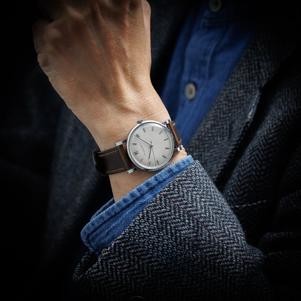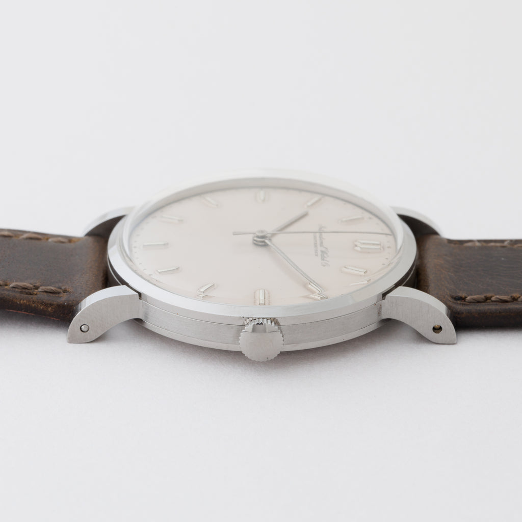 インターナショナルウォッチカンパニー1958年製ラウンド手巻モデルです。搭載キャリバーはマークⅪに採用されている事でも有名な手巻の名機Cal.89。ケースはラウンド型で存在感のあるラグが魅力的です。砲弾インデックス、パールドット等ヴィンテージの魅力を感じる文字盤で表面に若干荒れが確認できますが概ね綺麗です。ケースは小傷はございますが大きなダメージはございません。手巻きや針回しの操作はスムーズです。ベルトは社外の革ベルトを合わせています。こちらは分解掃除済みです。
