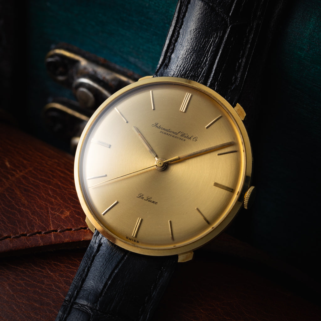 IWC DeLuxe ラウンドケース 1960年製/昭和35年製 18金無垢 Cal.401です。DeLuxeはオールドインターでもハイグレードモデルで同心円状の文字盤の仕上がりは特別感があります。Cal.401は当時最新の薄型高級ムーブメントになります。文字盤は表面の荒れが見られますが目立つシミ等無く綺麗です。ケースは小傷が見られますが大きなダメージはありません。革ベルトは社外のカーフが取り付けられています。