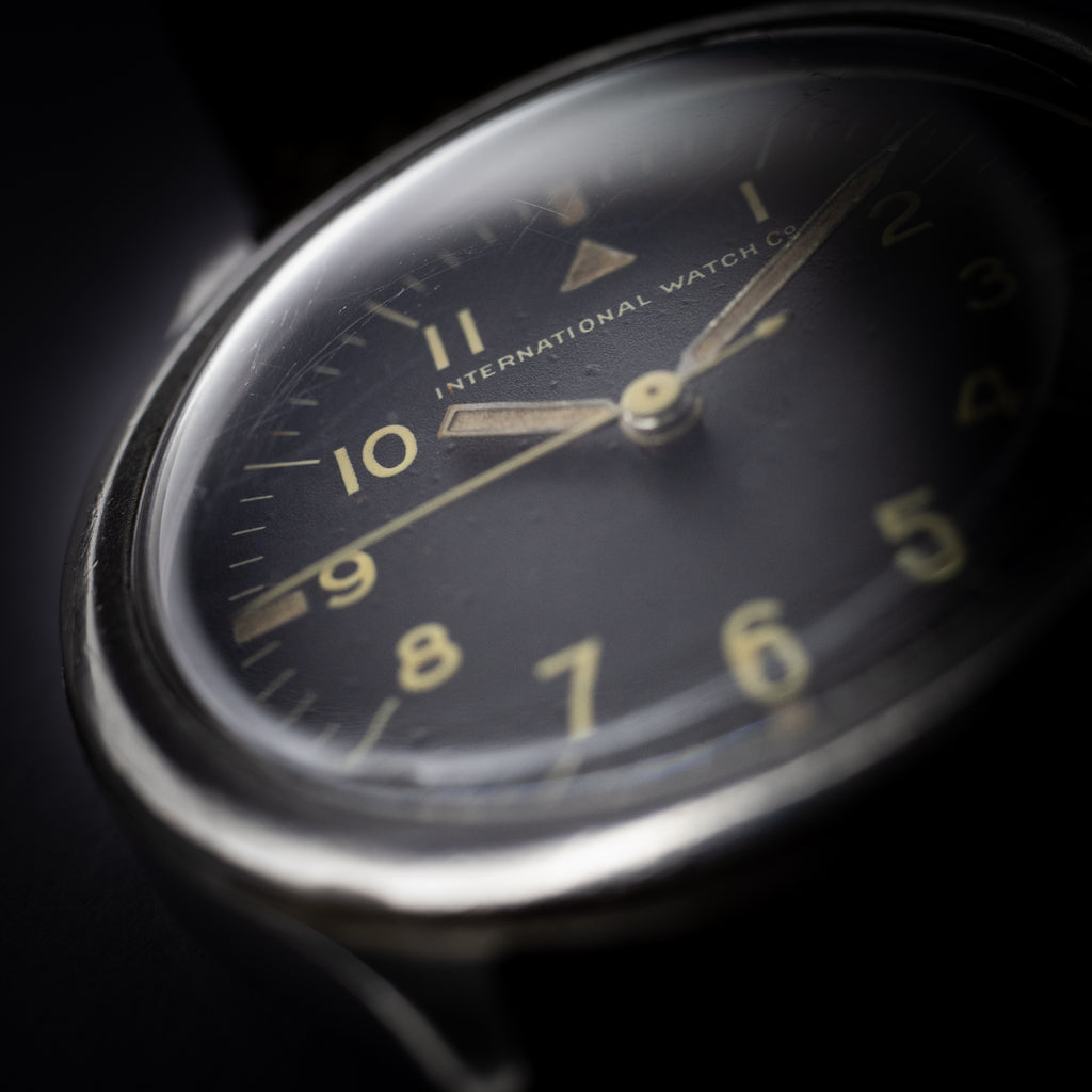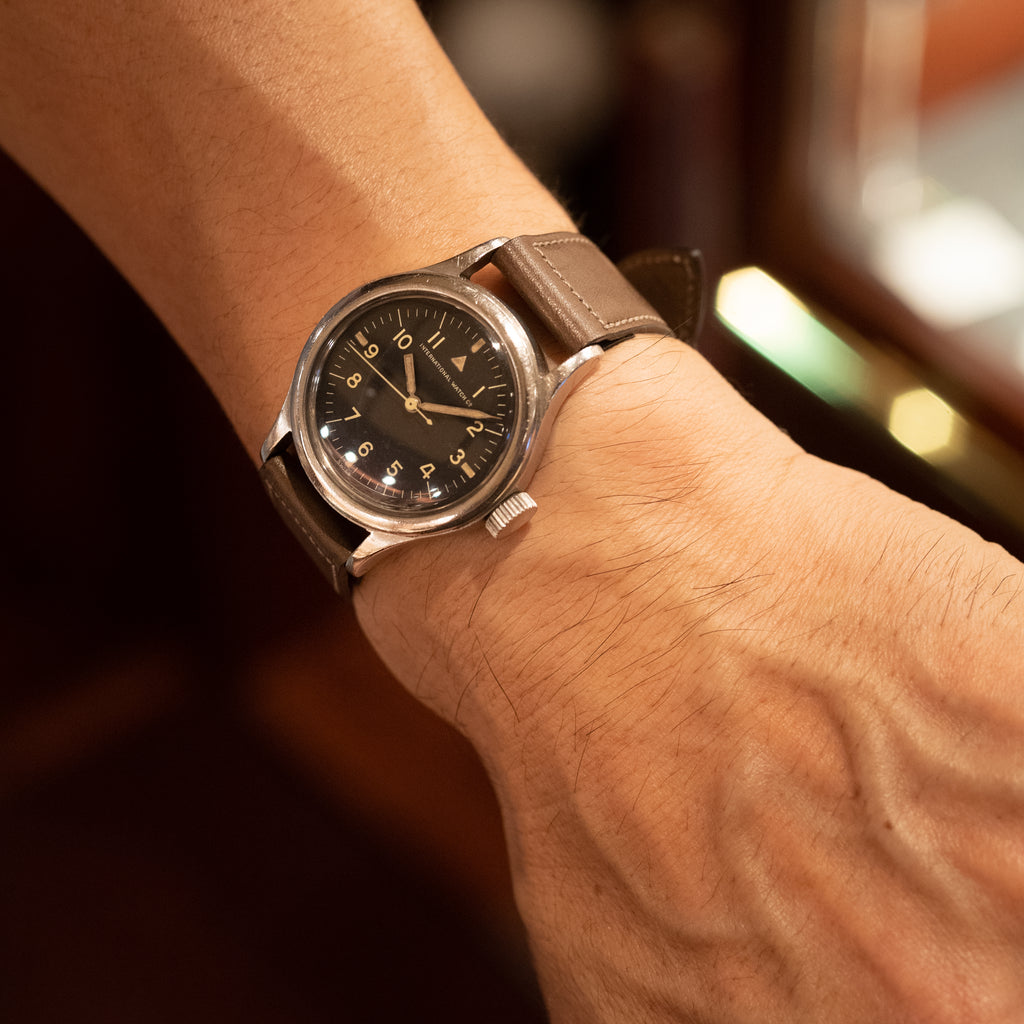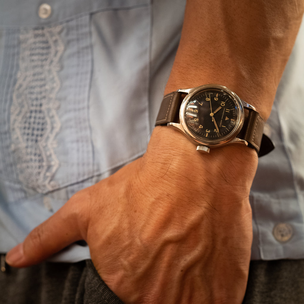インターナショナルウォッチカンパニーのオーストラリア空軍パイロットウォッチ 1957年製マーク11です。イギリス連邦のオーストラリア空軍(Royal Australian Air Force)に納品されたマーク11はイギリス軍とほぼ同じスペックで文字盤上にブロードアローやTマークが入らない仕様です。名作キャリバー89のハック機能付きで二重構造の頑丈な造りになっています。文字盤やケースはそれなりの経年劣化が見られますが、本物の軍用時計はやはり独特の存在感があります。ムーブメントは綺麗な状態です。手巻きや針回しの操作はスムースです。ベルトはヴィンテージモデルに相性抜群な「Accurate Form(アキュレイトフォルム)」のレザーベルトを装着しています。