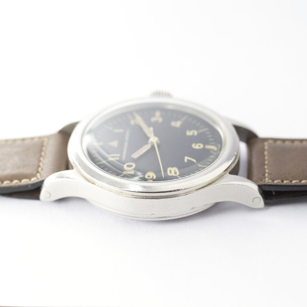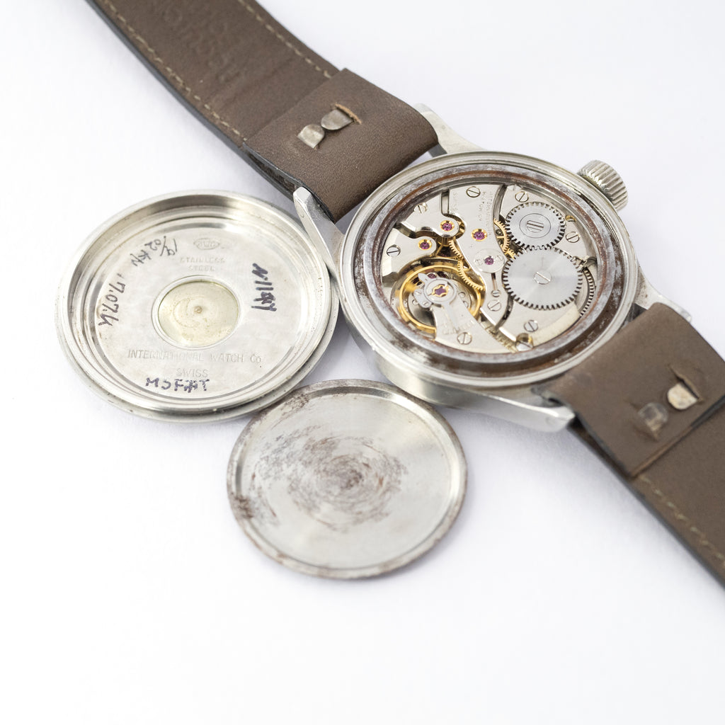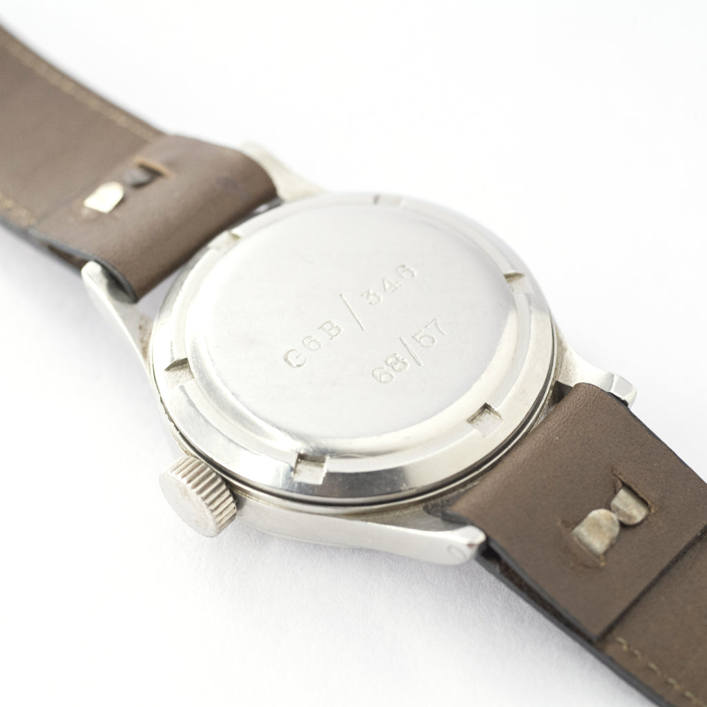 インターナショナルウォッチカンパニーのオーストラリア空軍パイロットウォッチ 1957年製マーク11です。イギリス連邦のオーストラリア空軍(Royal Australian Air Force)に納品されたマーク11はイギリス軍とほぼ同じスペックで文字盤上にブロードアローやTマークが入らない仕様です。名作キャリバー89のハック機能付きで二重構造の頑丈な造りになっています。文字盤やケースはそれなりの経年劣化が見られますが、本物の軍用時計はやはり独特の存在感があります。ムーブメントは綺麗な状態です。手巻きや針回しの操作はスムースです。ベルトはヴィンテージモデルに相性抜群な「Accurate Form(アキュレイトフォルム)」のレザーベルトを装着しています。