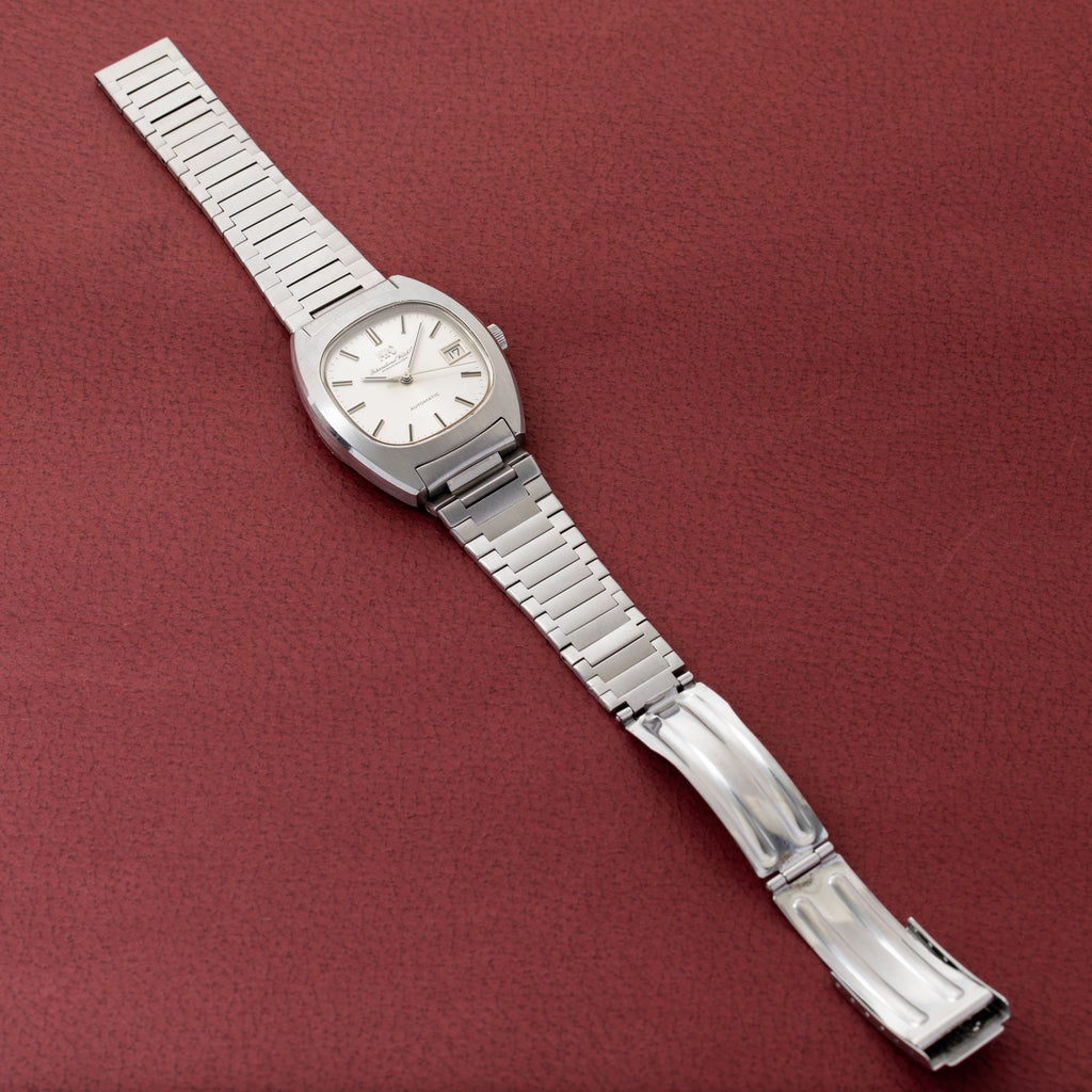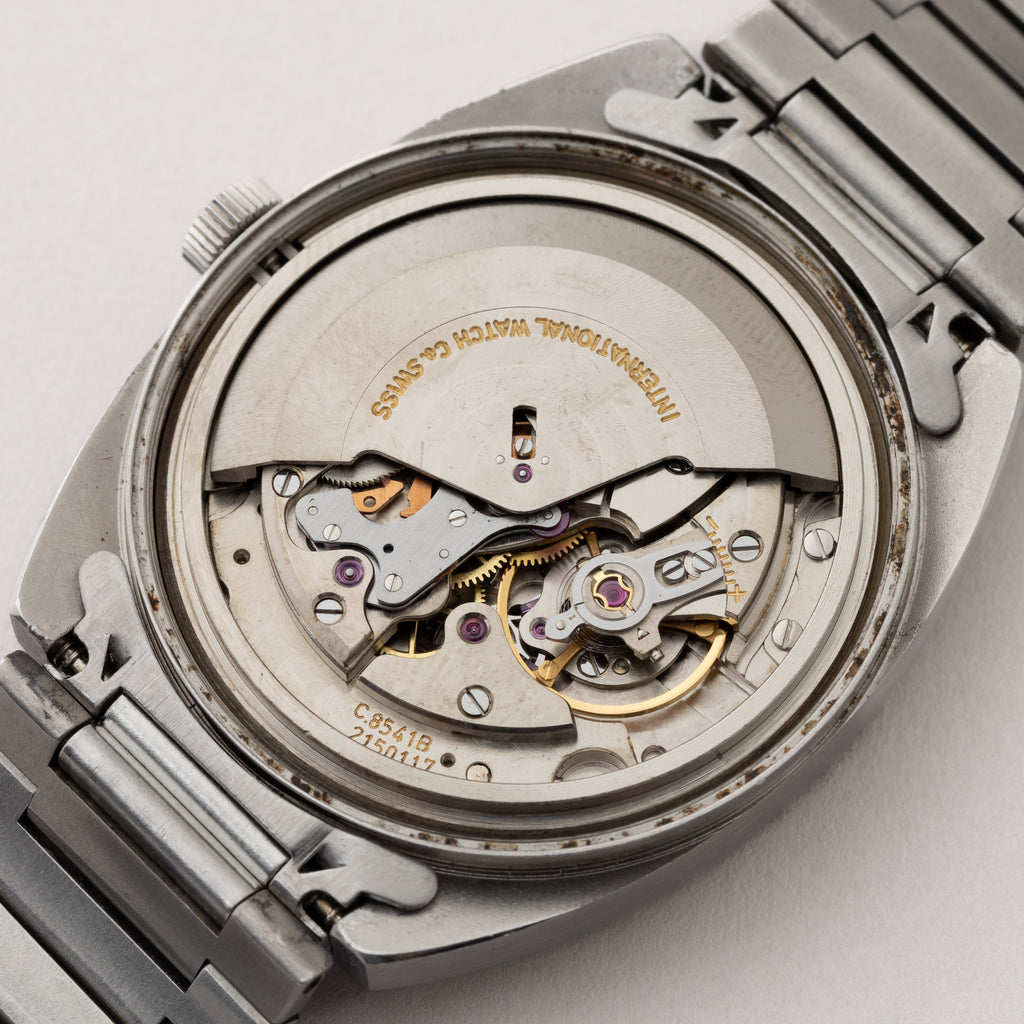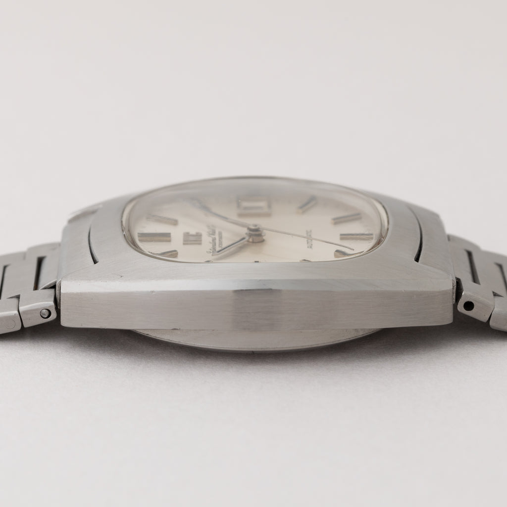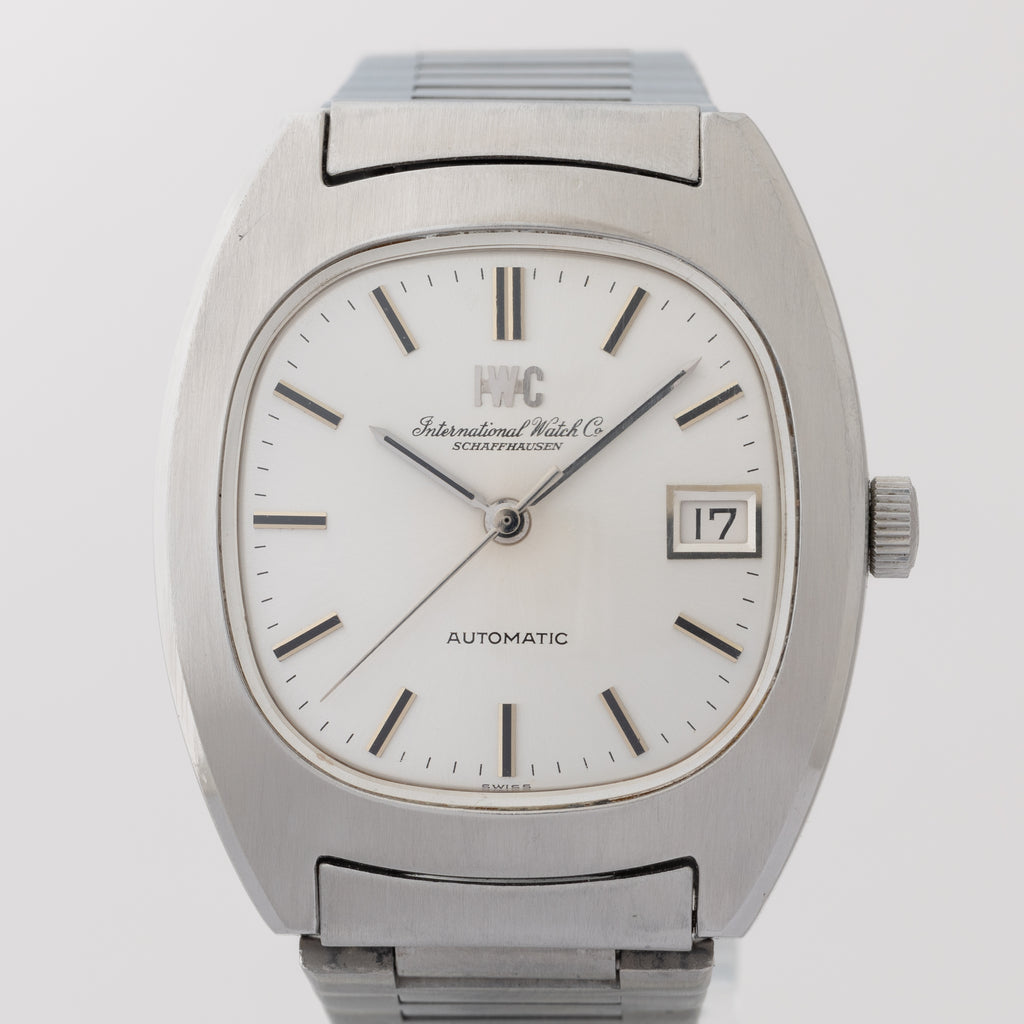 1973年製のIWCトノーケースオートマチックモデルです。IWCのアップライトのロゴと筆記体のレターが両方入るダイヤルは、非常に良いコンディションです。インデックスは石入りで高級感がございます。どっしりとしたトノーケースで装着時の存在感も楽しめます。ムーブメントはペラトン式自動巻き機構を採用したCal.8541B搭載しております。ケースは小傷はございますが大きなダメージはございません。手巻きや針回しの操作はスムースです。ベルトは純正ステンレスブレスが付いています。