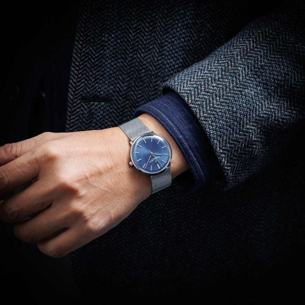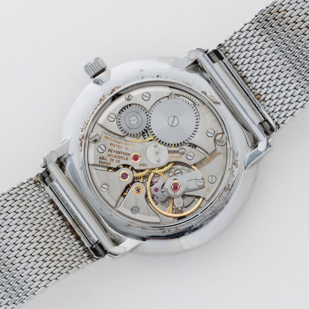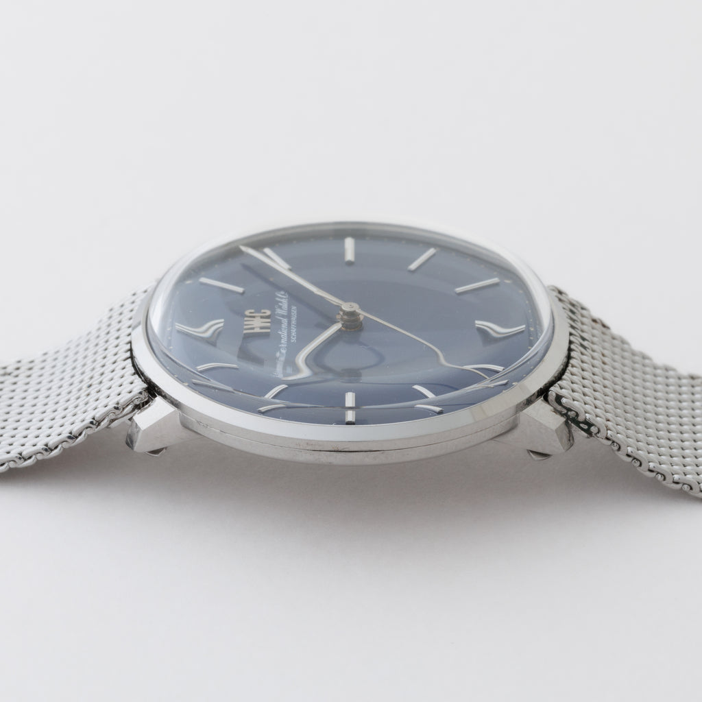 1973年製のIWC ラウンドケース Cal.403 ブルーダイヤルが純正メッシュブレス付きで入荷しました。繊細なラグと薄型ケースを採用し、軽やかな着用感が魅力です。オールドインターファンの方にとって嬉しい、植字でIWCとプリントで筆記体旧ロゴが配されたタイプです。荒れやすいブルーダイヤルは概ね良いコンディションを維持しており、ケースも小傷はありますが大きなダメージはありません。信頼度の高い薄型手巻きのCal.403は、IWCらしいブリッジの形状も惚れ惚れします。こちらは分解掃除済みです。