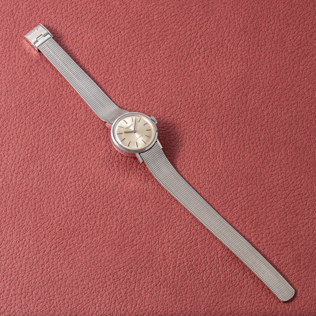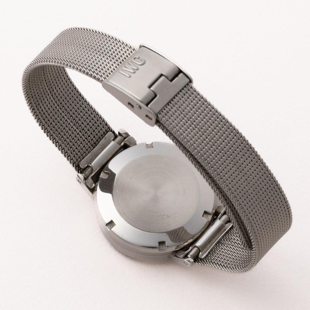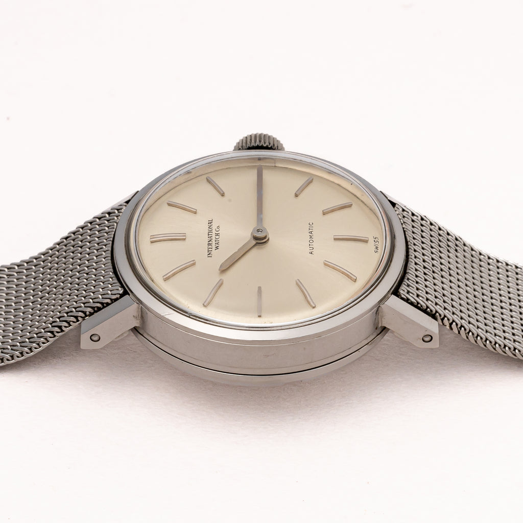 1969年製のIWCレディースオートマチックモデルです。ラウンド状のステンレスケースに落ち着いた雰囲気のこちらのモデルは主張しないので数々の場面や服装にも合わせやすいモデルかと思います。文字盤はシミや汚れの無いキレイな状態を保っています。ムーブメントは自動巻きのCal.44を搭載、手巻きや針回しの操作はスムースです。ケースは小傷はございますが大きなダメージはございません。ベルトは純正のステンレスメッシュブレスが取り付けてあります。