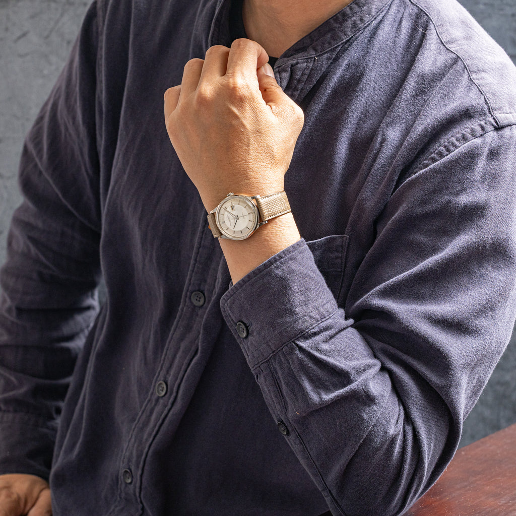 • ヴィンテージ時計の特性上、風防・パッキン・リューズ・バネ棒などの消耗部品は後年メンテナンス過程で交換されている場合がございます。オリジナル性を重視しておりますが、必要に応じて適切な部品にて調整されていますので、よりコレクション性重視のお求めのお客様は事前にご確認ください。