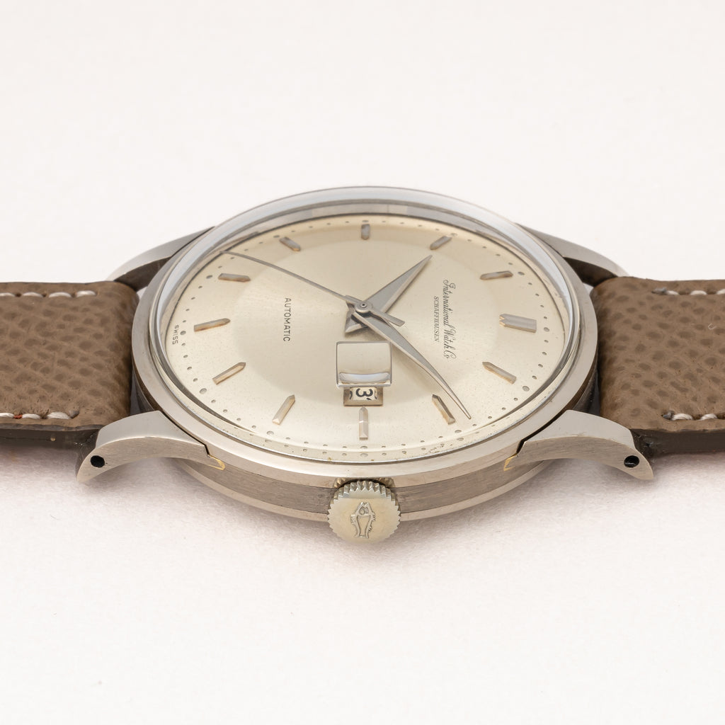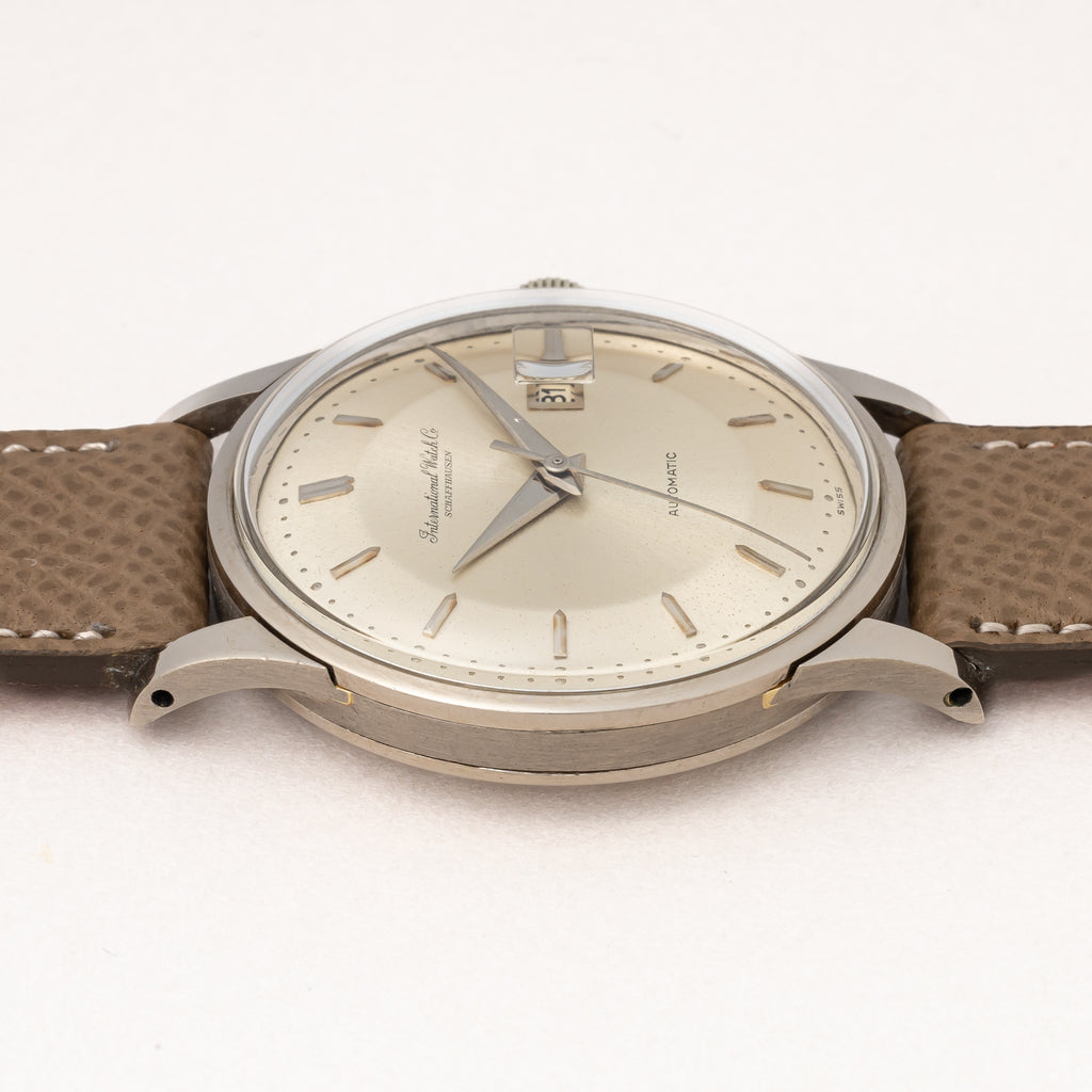 インターナショナルウォッチカンパニー Cal.8531搭載の貴重な18KWGケース 1961年製です。こちらはカレンダーが中央に寄っているタイプで通称『寄り目』と呼ばれていてます。IWCらしいシンプルな文字盤デザインと針の組み合わせに、パールドットの分点が映えます。18KWGケースは過度な磨きはされておらずオリジナルのシェイプを留めています。ムーブメントは自社キャリバーのペラトン式自動巻きのCal.8531を搭載しています。ベルトはヴィンテージモデルに相性抜群な「Accurate Form(アキュレイトフォルム)」のレザーベルトを装着しています。