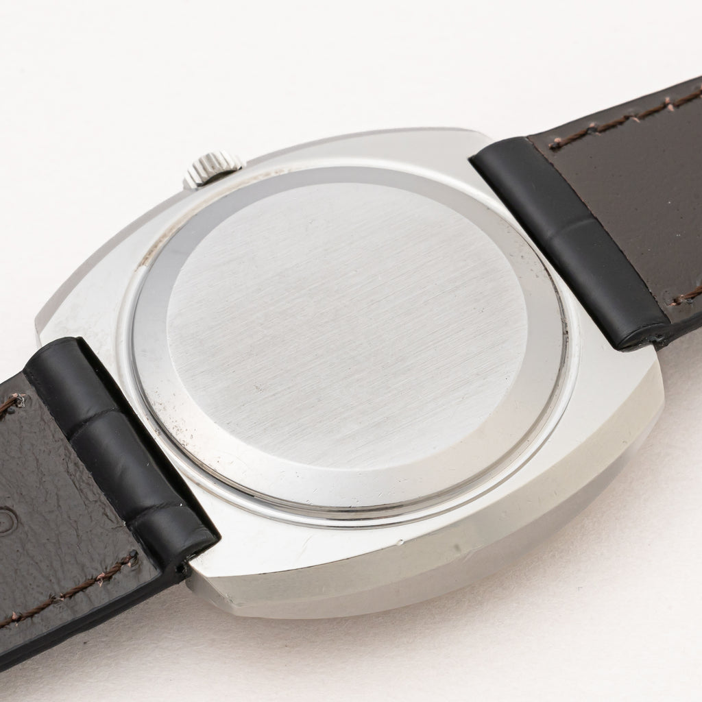 1970年代製の自動巻きモデルが入荷しました。シルバーのダイヤルはルーペで見ると若干の経年変化と小キズはありますが、肉眼で気になる様なダメージではありません。ボリュームのあるクッションケースは全体に小キズがありますが、オリジナルのシェイプを感じられます。ムーブメントは、ハック付きの自動巻きの854Bが搭載されております。手巻きや針回しの操作はスムーズです。ベルトはファイアーキッズのオリジナル革ベルトが取り付けてあります。こちらはOH済みです。